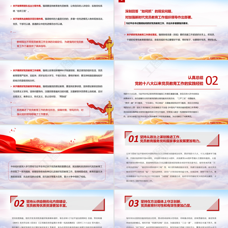 01深入學習領會總書記關于黨員教育的重要論述總書記從推進自我革命、建設世界大黨、鑄就千秋偉業的戰略高度,對黨員教育工作的本質屬性、基本內容、方法路徑、實施主體、組織領導等作出精辟論述,為新時代黨員教育工作提供了科學指南。