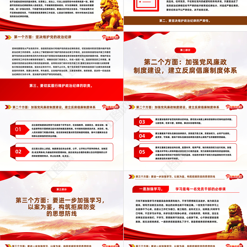 第一個方面:堅決維護黨的政治紀律第二個方面:加強黨風廉政制度建設,建立反腐倡廉制度體系。第三個方面:要進一步加強學習,以案為鑒,構筑拒腐防變的思想防線。