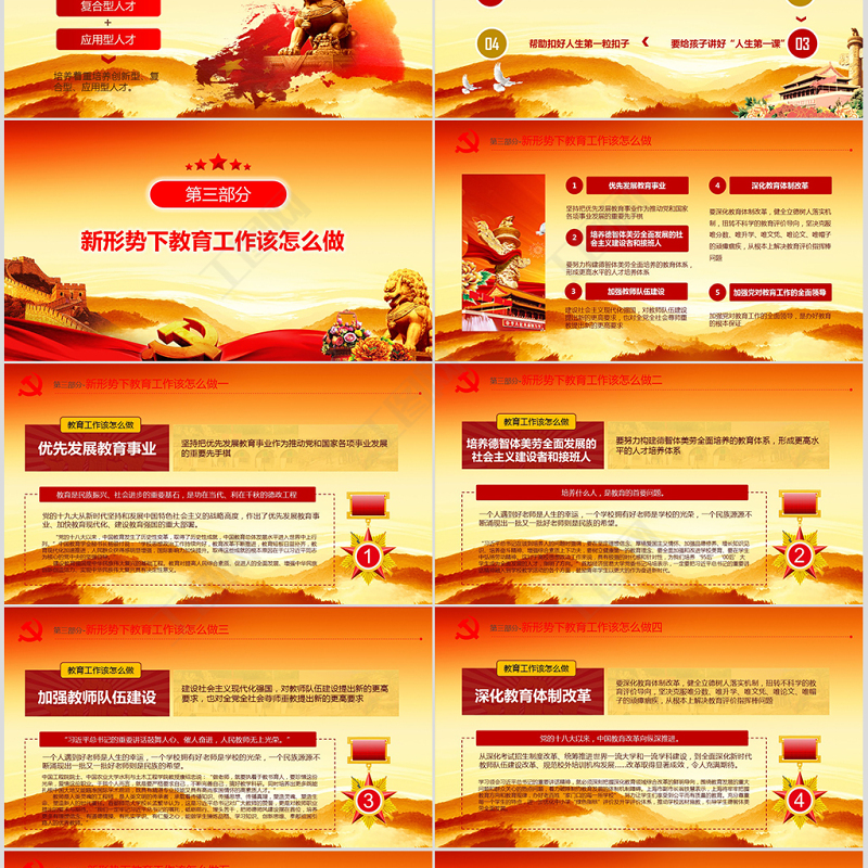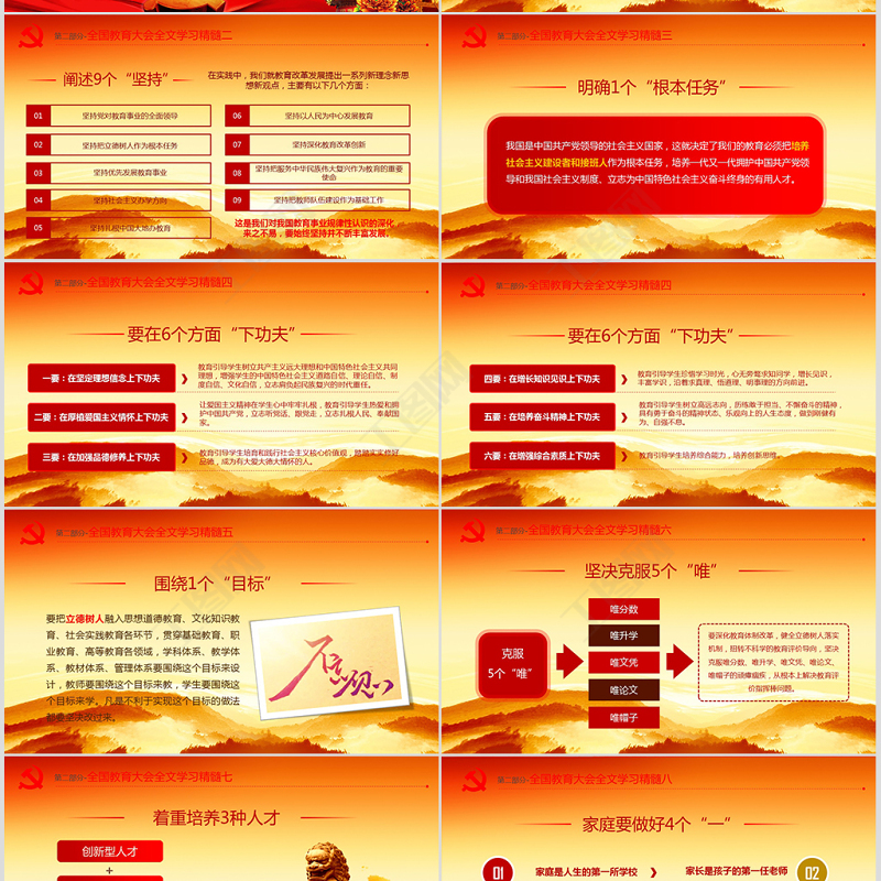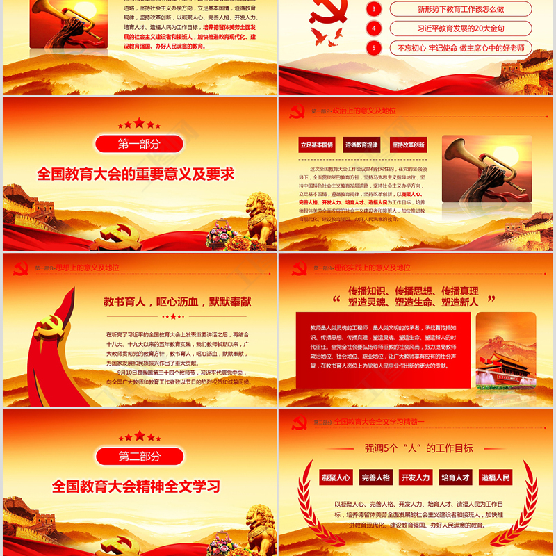 <p>延時(shí)符全國教育大會講話精神學(xué)習(xí)解讀辦圖網(wǎng)設(shè)計(jì)部</p><br><p>延時(shí)符全國教育大會9月10日在北京召開。中共中央總書記、國家主席、中央軍委主席出席會議并發(fā)表重要講話。他強(qiáng)調(diào),在黨的堅(jiān)強(qiáng)領(lǐng)導(dǎo)下,全面貫徹黨的教育方針,堅(jiān)持馬克思主義指導(dǎo)地位,堅(jiān)持中國特色社會主義教育發(fā)展道路,堅(jiān)持社會主義辦學(xué)方向,立足基本國情,遵循教育規(guī)律,堅(jiān)持改革創(chuàng)新,以凝聚人心、完善人格、開發(fā)人力、培育人才、造福人民為工作目標(biāo),培養(yǎng)德智體美勞全面發(fā)展的社會主義建設(shè)者和接班人,加快推進(jìn)教育現(xiàn)代化、建設(shè)教育強(qiáng)國、辦好人民滿意的教育。前 言</p><br><p>延時(shí)符1全國教育大會的重要意義及要求2全國教育大會精神全文學(xué)習(xí)3新形勢下教育工作該怎么做4教育發(fā)展的20大金句5不忘初心 牢記使命 做主席心中的好老師</p><br><p>延時(shí)符全國教育大會的重要意義及要求</p><br><p>第一部分-政治上的意義及地位 這次全國教育大會工作會議是有針對性的,在黨的堅(jiān)強(qiáng)領(lǐng)導(dǎo)下,全面貫徹黨的教育方針,堅(jiān)持馬克思主義指導(dǎo)地位,堅(jiān)持中國特色社會主義教育發(fā)展道路,堅(jiān)持社會主義辦學(xué)方向,立足基本國情,遵循教育規(guī)律,堅(jiān)持改革創(chuàng)新,以凝聚人心、完善人格、開發(fā)人力、培育人才、造福人民為工作目標(biāo),培養(yǎng)德智體美勞全面發(fā)展的社會主義建設(shè)者和接班人,加快推進(jìn)教育現(xiàn)代化、建設(shè)教育強(qiáng)國、辦好人民滿意的教育。立足基本國情遵循教育規(guī)律堅(jiān)持改革創(chuàng)新延時(shí)符</p><br><p>第一部分-思想上的意義及地位在聽完了的全國教育大會上發(fā)表重要講話之后,再結(jié)合十八大、十九大以來的五年教育實(shí)踐,我們教師長期以來,廣大教師貫徹黨的教育方針,教書育人,嘔心瀝血,默默奉獻(xiàn),為國家發(fā)展和民族振興作出了重大貢獻(xiàn)。 9月10日是我國第三十四個(gè)教師節(jié),代表黨中央,向全國廣大教師和教育工作者致以節(jié)日的熱烈祝賀和誠摯問候。教書育人,嘔心瀝血,默默奉獻(xiàn)延時(shí)符</p><br><p>第一部分-理論實(shí)踐上的意義及地位傳播知識、傳播思想、傳播真理塑造靈魂、塑造生命、塑造新人“”教師是人類靈魂的工程師,是人類文明的傳承者,承載著傳播知識、傳播思想、傳播真理,塑造靈魂、塑造生命、塑造新人的時(shí)代重任。全黨全社會要弘揚(yáng)尊師重教的社會風(fēng)尚,努力提高教師政治地位、社會地位、職業(yè)地位,讓廣大教師享有應(yīng)有的社會聲望,在教書育人崗位上為黨和人民事業(yè)作出新的更大的貢獻(xiàn)。延時(shí)符</p><br><p>延時(shí)符全國教育大會精神全文學(xué)習(xí)</p><br><p>第二部分-全國教育大會全文學(xué)習(xí)精髓一延時(shí)符以凝聚人心、完善人格、開發(fā)人力、培育人才、造福人民為工作目標(biāo),培養(yǎng)德智體美勞全面發(fā)展的社會主義建設(shè)者和接班人,加快推進(jìn)教育現(xiàn)代化、建設(shè)教育強(qiáng)國、辦好人民滿意的教育。凝聚人心完善人格開發(fā)人力培育人才造福人民</p><br><p>第二部分-全國教育大會全文學(xué)習(xí)精髓二延時(shí)符在實(shí)踐中,我們就教育改革發(fā)展提出一系列新理念新思想新觀點(diǎn),主要有以下幾個(gè)方面:這是我們對我國教育事業(yè)規(guī)律性認(rèn)識的深化,來之不易,要始終堅(jiān)持并不斷豐富發(fā)展。</p><br><p>第二部分-全國教育大會全文學(xué)習(xí)精髓三延時(shí)符</p><br><p>第二部分-全國教育大會全文學(xué)習(xí)精髓四教育引導(dǎo)學(xué)生樹立共產(chǎn)主義遠(yuǎn)大理想和中國特色社會主義共同理想,增強(qiáng)學(xué)生的中國特色社會主義道路自信、理論自信、制度自信、文化自信,立志肩負(fù)起民族復(fù)興的時(shí)代重任。一要:在堅(jiān)定理想信念上下功夫讓愛國主義精神在學(xué)生心中牢牢扎根,教育引導(dǎo)學(xué)生熱愛和擁護(hù)中國共產(chǎn)黨,立志聽黨話、跟黨走,立志扎根人民、奉獻(xiàn)國家。二要:在厚植愛國主義情懷上下功夫教育引導(dǎo)學(xué)生培育和踐行社會主義核心價(jià)值觀,踏踏實(shí)實(shí)修好品德,成為有大愛大德大情懷的人。三要:在加強(qiáng)品德修養(yǎng)上下功夫延時(shí)符</p><br><p>第二部分-全國教育大會全文學(xué)習(xí)精髓四教育引導(dǎo)學(xué)生珍惜學(xué)習(xí)時(shí)光,心無旁騖求知問學(xué),增長見識,豐富學(xué)識,沿著求真理、悟道理、明事理的方向前進(jìn)。四要:在增長知識見識上下功夫教育引導(dǎo)學(xué)生樹立高遠(yuǎn)志向,歷練敢于擔(dān)當(dāng)、不懈奮斗的精神,具有勇于奮斗的精神狀態(tài)、樂觀向上的人生態(tài)度,做到剛健有為、自強(qiáng)不息。五要:在培養(yǎng)奮斗精神上下功夫教育引導(dǎo)學(xué)生培養(yǎng)綜合能力,培養(yǎng)創(chuàng)新思維。六要:在增強(qiáng)綜合素質(zhì)上下功夫延時(shí)符</p><br><p>第二部分-全國教育大會全文學(xué)習(xí)精髓五延時(shí)符要把立德樹人融入思想道德教育、文化知識教育、社