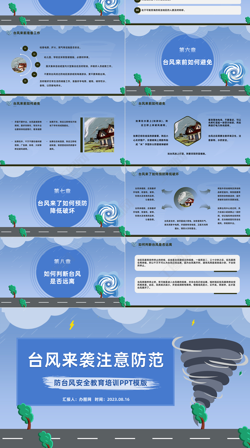 防臺風安全教育培訓PPT模版臺風來襲注意防范匯報人:辦圖網 時間:2023.08.16