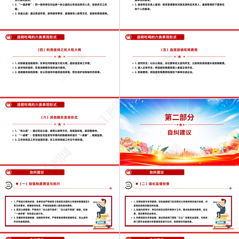 工圖網提供體制內違規吃喝超標接待的六類表現形式及自糾建議PPT課件供會員免費下載。更多精彩黨課PPT素材,盡在工圖網。