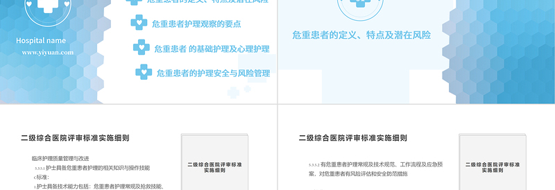 Hospital namewww.yiyuan.comContents/目錄危重患者的定義、特點及潛在風險危重患者護理觀察的要點危重患者 的基礎護理及心理護理危重患者的護理安全與風險管理