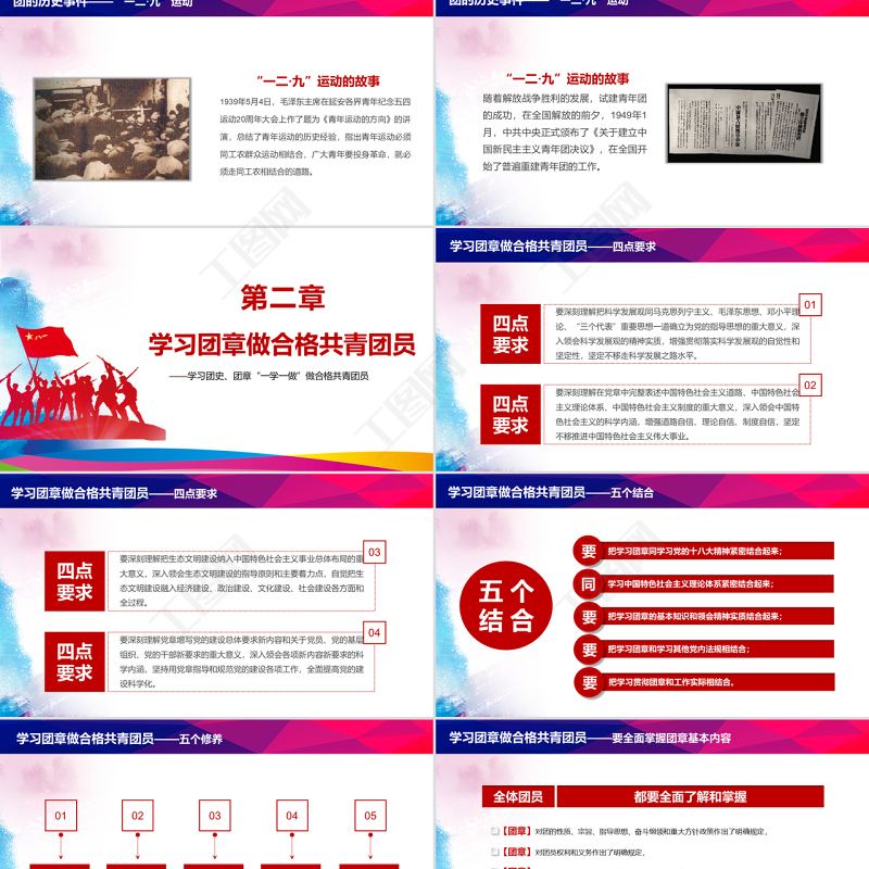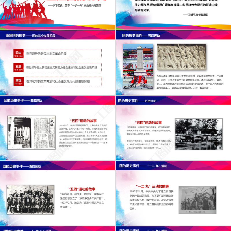 團(tuán)的歷史事件——“一二·九”運(yùn)動(dòng)“一二·九”運(yùn)動(dòng)的故事隨著解放戰(zhàn)爭勝利的發(fā)展,試建青年團(tuán)的成功,在全國解放的前夕,1949年1月,中共中央正式頒布了《關(guān)于建立中國新民主主義青年團(tuán)決議》,在全國開始了普遍重建青年團(tuán)的工作。