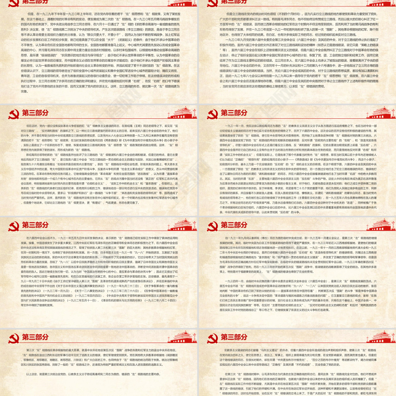 第三部分 但在這時,黨內一部分沒有實際革命斗爭經驗的犯“左”傾教條主義錯誤的同志,在陳紹禹(王明)同志的領導之下,卻又在“反對立三路線”、“反對調和路線”的旗幟之下,以一種比立三路線更強烈的宗派主義的立場,起來反抗六屆三中全會后的中央了。他們的斗爭,并不是在幫助當時的中央徹底清算立三路線的思想實質,以及黨內從八七會議以來特別是一九二九年以來就存在著而沒有受到清算的若干“左”傾思想和“左”傾政策;在當時發表的陳紹禹同志的《兩條路線》即《為中共更加布爾什維克化而斗爭》的小冊子中,實際上是提出了一個在新的形態下,繼續、恢復或發展立三路線和其他“左”傾思想“左”傾政策的新的政治綱領。這樣,“左”傾思想在黨內就獲得了新的滋長,而形成為新的“左”傾路線。 陳紹禹同志領導的新的“左”傾路線雖然也批評了立三路線的“左”傾錯誤和六屆三中全會的調和錯誤,但是它的特點,是它主要地反而批評了立三路線的“右”,是它指責六屆三中全會“對立三路線的一貫右傾機會主義的理論與實際,未加以絲毫揭破和打擊”,指責第九十六號通告沒有看出“右傾依然是目前黨內主要危險”。新的“左”傾路線在中國社會性質、階級關系的問題上,夸大資本主義在中國經濟中的比重,夸大中國現階段革命中反資產階級斗爭、反富農斗爭和所謂“社會主義革命成分”的意義,否認中間營壘和第三派的存在。在革命形勢和黨的任務問題上,它繼續強調全國性的“革命高潮”和黨在全國范圍的“進攻路線”,認為所謂“直接革命形勢”很快地即將包括一個或幾個有中心城市在內的主要省份。它并從“左”的觀點污蔑中國當時還沒有“真正的”紅軍和工農兵代表會議政府,特別強調地宣稱當時黨內的主要危險是所謂“右傾機會主義”、“實際工作中的機會主義”和“富農路線”。在組織上,這條新的“左”傾路線的代表者們違反組織紀律,拒絕黨所分配的工作,錯誤地結合一部分同志進行反中央的宗派活動,錯誤地在黨員中號召成立臨時的中央領導機關,要求以“積極擁護和執行”這一路線的“斗爭干部”“來改造和充實各級的領導機關”等,因而造成了當時黨內的嚴重危機。這樣,雖然新的“左”傾路線并沒有主張在中心城市組織起義,在一個時期內也沒有主張集中紅軍進攻中心城市,但是整個地說來,它卻比立三路線的“左”傾更堅決,更“有理論”,氣焰更盛,形態也更完備了。
