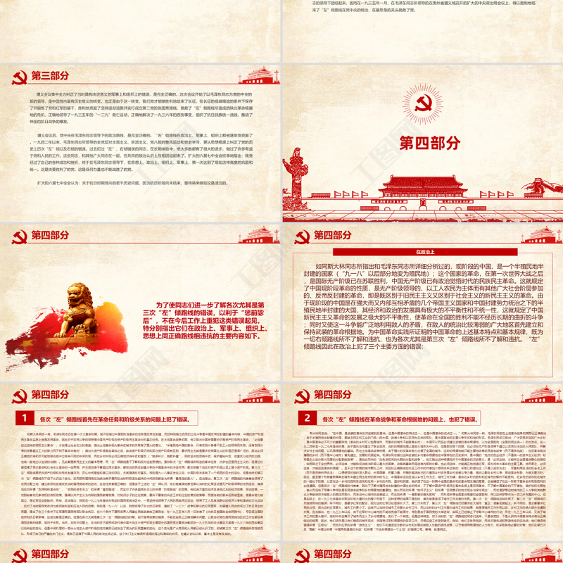 第二部分 中國共產黨,并且只有中國共產黨,在反革命的極端恐怖的統治下,全黨團結一致地繼續高舉著反帝反封建的大旗,領導廣大的工人、農民、士兵、革命知識分子和其他革命群眾,作了政治上、軍事上和思想上的偉大戰斗。在這個戰斗中,中國共產黨創造了紅軍,建立了工農兵代表會議的政府,建立了革命根據地,分配了土地給貧苦的農民,抗擊了當時國民黨反動政府的進攻和一九三一年“九一八”以來的日本帝國主義的侵略,使中國人民的新民主主義的民族解放和社會解放的事業,取得了偉大的成績。全黨對于企圖分裂黨和實行叛黨的托洛茨基陳獨秀派和羅章龍、張國燾等的反革命行為,也同樣團結一致地進行了斗爭,使黨保證了在馬克思列寧主義總原則下的統一。在這十年內,黨的這個總方針和為實行這個總方針的英勇奮斗,完全是正確的和必要的。無數黨員、無數人民和很多黨外革命家,當時在各個戰線上轟轟烈烈地進行革命斗爭,他們的奮斗犧牲、不屈不撓、前仆后繼的精神和功績,在民族的歷史上永垂不朽。假如沒有這一切,則抗日戰爭即不能實現;即使實現,亦將因為沒有一個積蓄了人民戰爭豐富經驗的中國共產黨作為骨干,而不能堅持和取得勝利。這是毫無疑義的。 尤其值得我們慶幸的是,我們黨以毛澤東同志為代表,創造性地把馬克思、恩格斯、列寧、斯大林的革命學說應用于中國條件的工作,在這十年內有了很大的發展。我黨終于在土地革命戰爭的最后時期,確立了毛澤東同志在中央和全黨的領導。這是中國共產黨在這一時期的最大成就,是中國人民獲得解放的最大保證。 但是我們必須指出,在這十年內,我黨不僅有了偉大的成就,而且在某些時期中也犯過一些錯誤。其中以從黨的一九三一年一月第六屆中央委員會第四次全體會議(六屆四中全會)到一九三五年一月擴大的中央政治局會議(遵義會議)這個時期內所犯政治路線、軍事路線和組織路線上的“左”傾錯誤,最為嚴重。這個錯誤,曾經給了我黨和中國革命以嚴重的損失。從一九二七年革命失敗至一九三七年抗日戰爭爆發的十年間