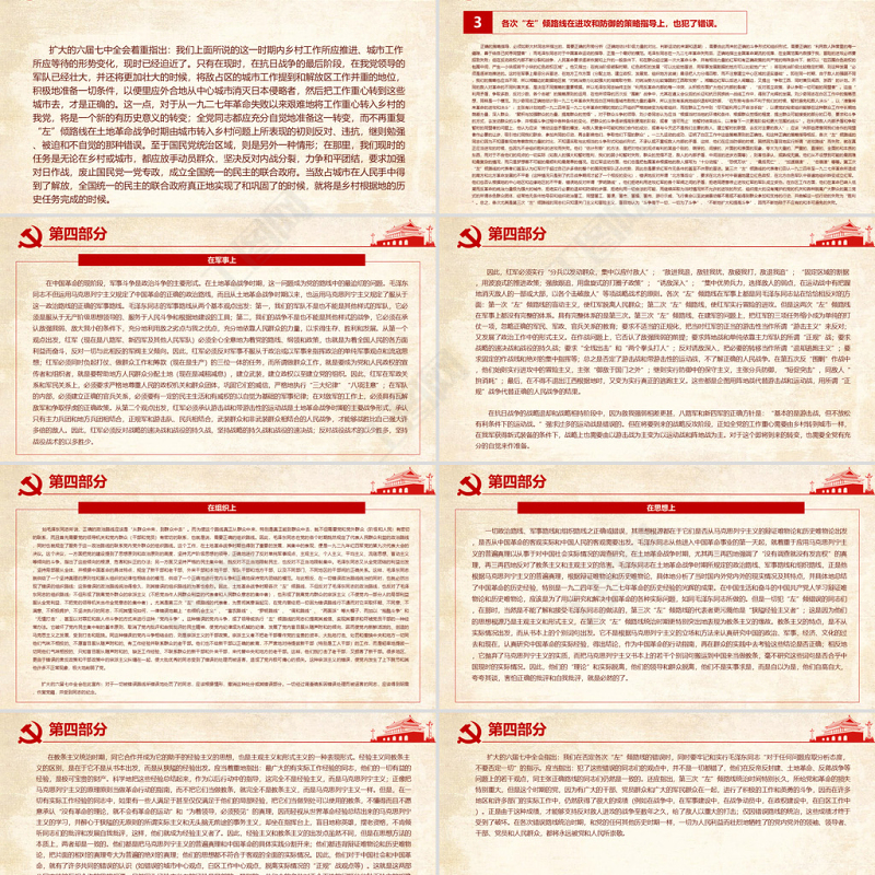 第三部分 但是立三路線在黨內的統治時間也很短(不到四個月時間)。因為凡實行立三路線的地方都使黨和革命力量受到了損失,廣大的干部和黨員都要求糾正這一路線。特別是毛澤東同志,他不但始終沒有贊成立三路線,而且以極大的忍耐心糾正了紅一方面軍中的“左”傾錯誤,因而使江西革命根據地的紅軍在這個時期內不但沒有受到損失,反而利用了當時蔣馮閻戰爭的有利形勢而得到了發展,并在一九三〇年底至一九三一年初勝利地粉碎了敵人的第一次“圍剿”。其他革命根據地的紅軍,除個別地區外,也得到了大體相同的結果。在白區,也有許多做實際工作的同志,經過黨的組織起來反對立三路線。 一九三〇年九月黨的第六屆中央委員會第三次全體會議(六屆三中全會)及其后的中央,對于立三路線的停止執行是起了積極作用的。雖然六屆三中全會的文件還表現了對立三路線調和妥協的精神(如否認它是路線錯誤,說它只是“策略上的錯誤”等),雖然六屆三中全會在組織上還繼續著宗派主義的錯誤,但是六屆三中全會既然糾正了立三路線對于中國革命形勢的極左估計,停止了組織全國總起義和集中全國紅軍進攻中心城市的計劃,恢復了黨、團、工會的獨立組織和經常工作,因而它就結束了作為立三路線主要特征的那些錯誤。立三同志本人,在六屆三中全會上也承認了被指出的錯誤,接著就離開了中央的領導地位。六屆三中全會后的中央,又在同年十一月的補充決議和十二月的第九十六號通告中,進一步地指出了立三同志等的路線錯誤和六屆三中全會的調和錯誤。當然,無論六屆三中全會或其后的中央,對于立三路線的思想實質,都沒有加以清算和糾正,因此一九二七年八七會議以來特別是一九二九年以來一直存在于黨內的若干“左”傾思想和“左”傾政策,在六屆三中全會上和六屆三中全會后還是濃厚地存在著。但是六屆三中全會及其后的中央既然對于停止立三路線作了上述有積極作用的措施,當時全黨同志就應該在這些措施的基礎上繼續努力,以求反“左”傾錯誤的貫徹。