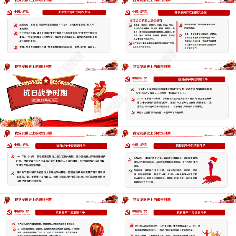我黨發(fā)展史上的艱難時期中國共產(chǎn)黨Communist Party of China抗日戰(zhàn)爭中反清剿斗爭在敵占區(qū),日軍以“清鄉(xiāng)”為主,普遍建立漢奸政權(quán),強化保甲制度,鎮(zhèn)壓人民的反日運動,進行奴化教育和政治欺騙,實行殘酷的殖民統(tǒng)治。在游擊區(qū),日軍推行“蠶食”政策,大量修筑公路網(wǎng)、碉堡群、封鎖溝、封鎖墻和崗樓,制造“無人區(qū)”,以防止人民武裝深入游擊區(qū)和敵占區(qū)活動。對敵后抗日根據(jù)地,日軍以“掃蕩”為主,實行極其野蠻殘忍的“三光”政策。