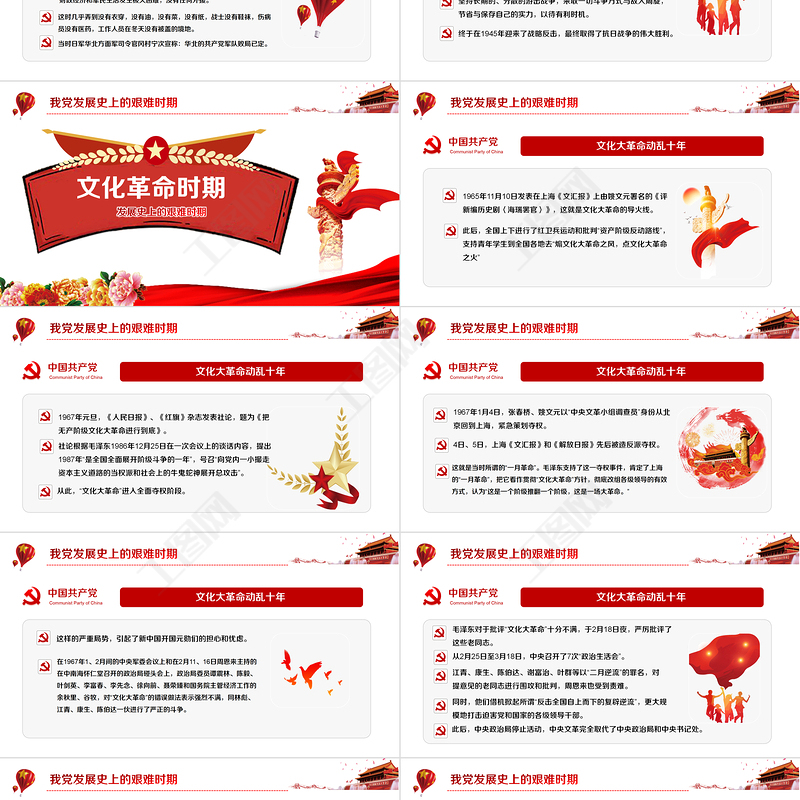 我黨發(fā)展史上的艱難時期中國共產(chǎn)黨Communist Party of China文化大革命動亂十年1965年11月10日發(fā)表在上?!段膮R報》上由姚文元署名的《評新編歷史劇〈海瑞罷官〉》,這就是文化大革命的導(dǎo)火線。此后,全國上下進行了紅衛(wèi)兵運動和批判“資產(chǎn)階級反動路線”,支持青年學(xué)生到全國各地去“煽文化大革命之風(fēng),點文化大革命之火”