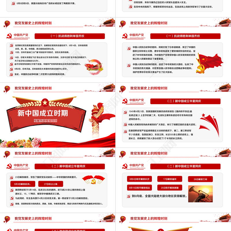 我黨發(fā)展史上的輝煌時刻中國共產(chǎn)黨Communist Party of China到9月底,全國大陸絕大部分地區(qū)獲得解放。8月4日和平解放長沙17日解放福州26日解放蘭州9月19日和平解放綏遠25日和平解放新疆(二)新中國成立華夏同慶