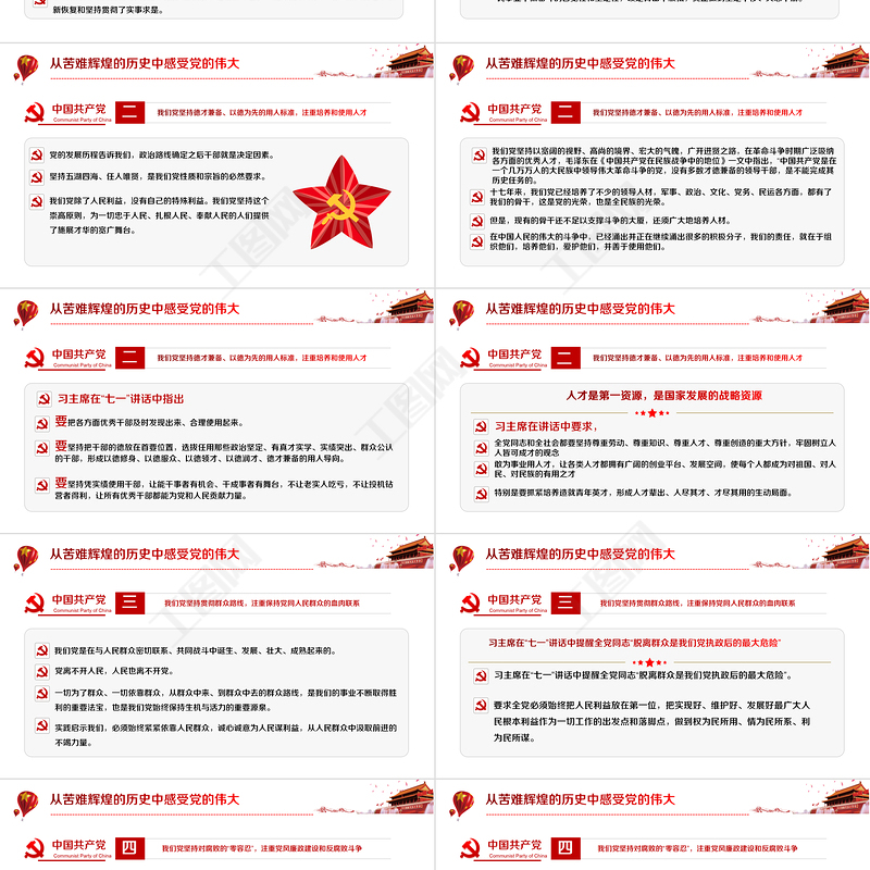 從苦難輝煌的歷史中感受黨的偉大中國共產(chǎn)黨Communist Party of China我們黨堅持德才兼?zhèn)?、以德為先的用人標準,注重培養(yǎng)和使用人才二習(xí)主席在講話中要求,全黨同志和全社會都要堅持尊重勞動、尊重知識、尊重人才、尊重創(chuàng)造的重大方針,牢固樹立人人皆可成才的觀念敢為事業(yè)用人才,讓各類人才都擁有廣闊的創(chuàng)業(yè)平臺、發(fā)展空間,使每個人都成為對祖國、對人民、對民族的有用之才特別是要抓緊培養(yǎng)造就青年英才,形成人才輩出、人盡其才、才盡其用的生動局面。人才是第一資源,是國家發(fā)展的戰(zhàn)略資源