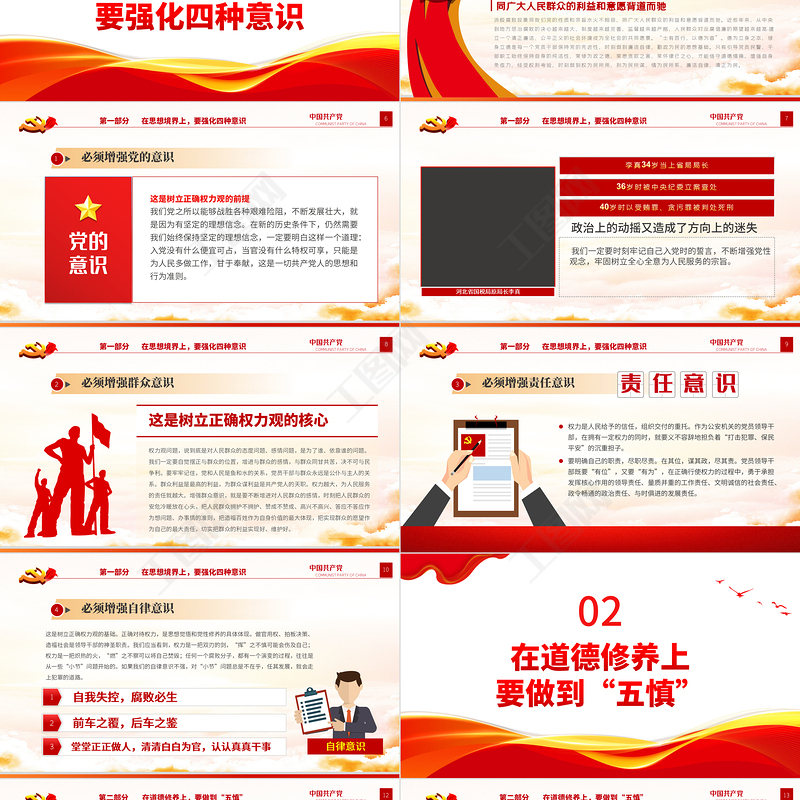 第一部分 在思想境界上,要強(qiáng)化四種意識(shí)必須增強(qiáng)黨的意識(shí)這是樹立正確權(quán)力觀的前提 我們黨之所以能夠戰(zhàn)勝各種艱難險(xiǎn)阻,不斷發(fā)展壯大,就是因?yàn)橛袌?jiān)定的理想信念。在新的歷史條件下,仍然需要我們始終保持堅(jiān)定的理想信念,一定要明白這樣一個(gè)道理:入黨沒有什么便宜可占,當(dāng)官?zèng)]有什么特權(quán)可享,只能是為人民多做工作,甘于奉獻(xiàn),這是一切共產(chǎn)黨人的思想和行為準(zhǔn)則。