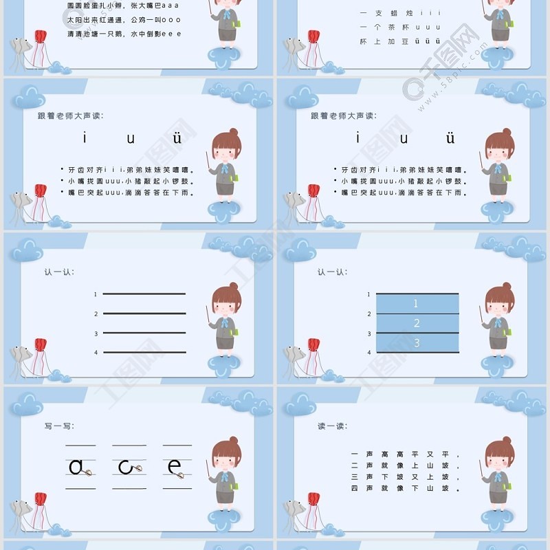 跟著老師大聲讀:牙齒對齊i i i,弟弟妹妹笑嘻嘻。小嘴攏圓uuu,小豬敲起小鑼鼓。嘴巴突起uuu,滴滴答答在下雨。üui