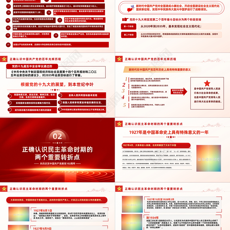 前言PREFACE 2023年是中國共產黨成立102周年,是黨的二十大召開之年,也是進入全面建設社會主義現代化國家、向第一個百年奮斗目標進軍新征程的重要一年。中國共產黨人的初心和使命就是為中國人民謀幸福、為中華民族謀復興。正是由于矢志踐行初心使命,102多年來,不管形勢和任務如包變化,不管遇到什么樣的驚濤駭浪,我們黨都始終把握歷史主動,錨定奮斗目標,沿著正確方向堅定前行。 為隆重慶祝中國共產黨成立102周年,我們召開此次專題學習,把愛黨愛國熱情轉化為實際行動,以優異成績向黨的二十大獻禮。