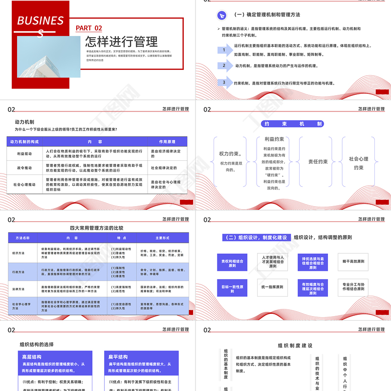 管理機制的涵義:是指管理系統(tǒng)的結(jié)構(gòu)及其運行機理。主要包括運行機制、動力機制和約束機制三個子機制。(一)確定管理機制和管理方法運行機制主要指組織基本職能的活動方式、系統(tǒng)功能和運行原理。體現(xiàn)在組織結(jié)構(gòu)上,如直線制、職能制、直線職能制、事業(yè)部制、矩陣制等。動力機制,是指管理系統(tǒng)動力的產(chǎn)生與運作的機理。約束機制,是指對管理系統(tǒng)行為進行限定與修正的功能與機理。