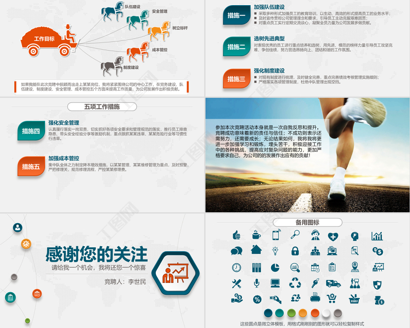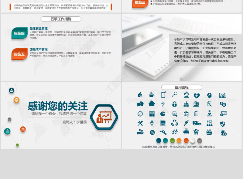 五項工作措施隊伍建設工作目標安全管理樹立標桿成本管控制度建設如果我能在此次競聘中脫穎而出走上某某崗位,我將緊緊圍繞公司的中心工作,在黨務建設、隊伍建設、制度建設、安全管理、成本管控五個方面來提高工作質量,為公司發展作出積極貢獻。