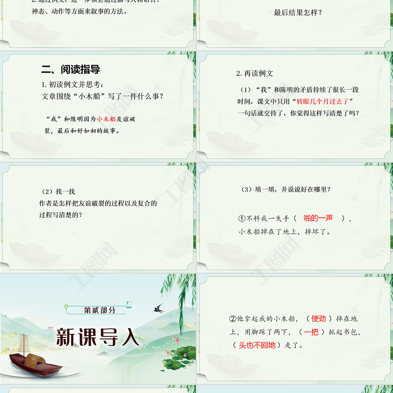 二、閱讀指導文章圍繞“小木船”寫了一件什么事?“我”和陳明因為小木船友誼破裂,最后和好如初的故事。1.初讀例文并思考:
