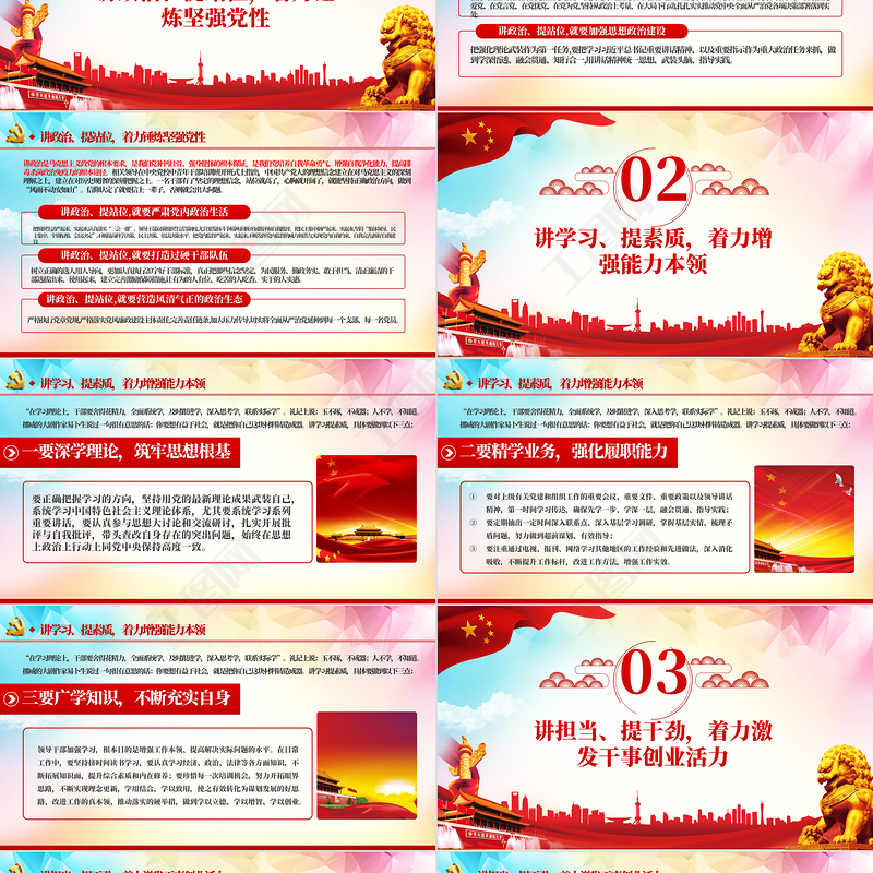 講政治、提站位,著力錘煉堅強黨性01講學(xué)習(xí)、提素質(zhì),著力增強能力本領(lǐng)02講擔(dān)當(dāng)、提干勁,著力激發(fā)干事創(chuàng)業(yè)活力03講規(guī)矩、提形象,著力發(fā)揮先鋒模范作用04
