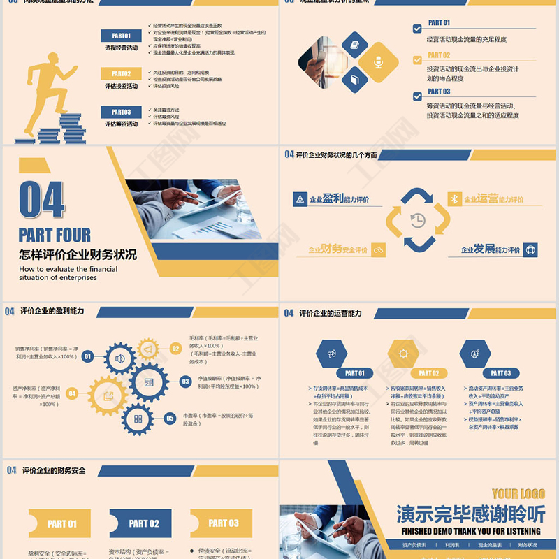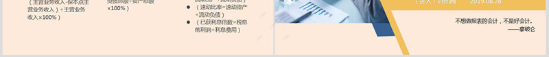 演示完畢感謝聆聽FINISHED DEMO THANK YOU FOR LISTENING不想做報表的會計,不是好會計。——拿破侖2019.08.28YOUR LOGO資產負債表利潤表現金流量表財務狀況主講人:辦圖網