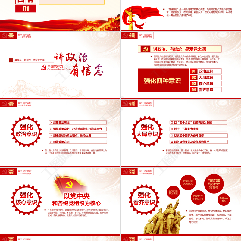 任何政黨都是政治組織,黨員是黨肌體的最小細胞。作為一名黨員,愛黨是首要之職,而講政治是愛黨的具體表現,有信念是愛黨的力量源泉。講政治、有信念就必須要有政治意識、大局意識、核心意識和看齊意識,保持政治本色,把理想信念時時處處體現為行動的力量。講政治、有信念 是愛黨之源政治意識大局意識核心意識看齊意識01020304