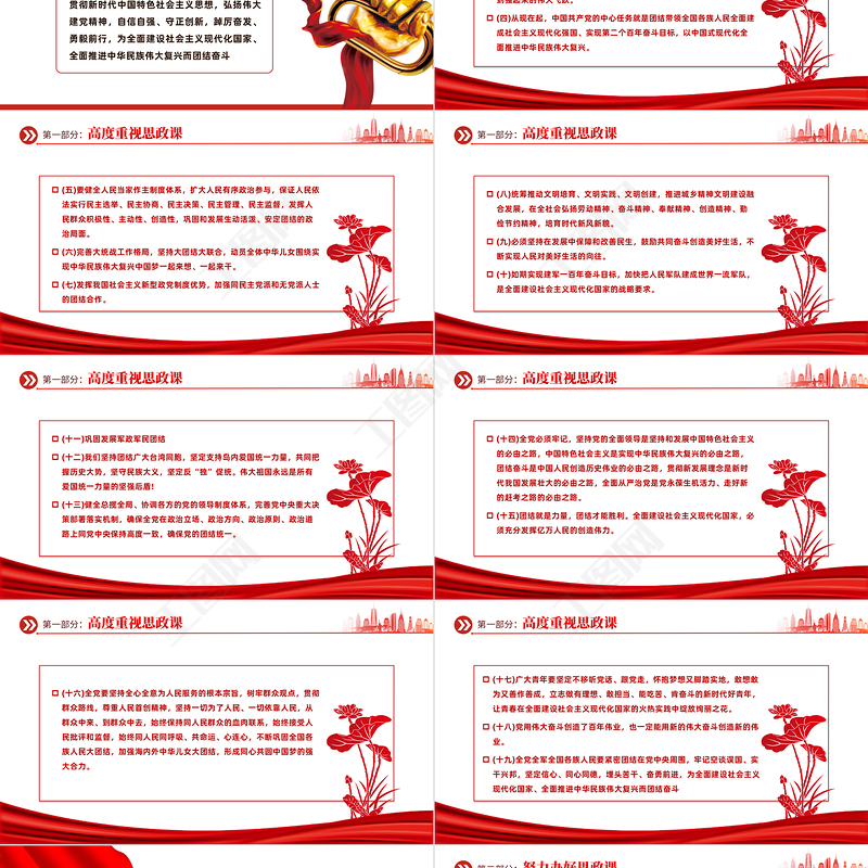 (十一)鞏固發(fā)展軍政軍民團結 (十二)我們堅持團結廣大臺灣同胞,堅定支持島內愛國統(tǒng)一力量,共同把握歷史大勢,堅守民族大義,堅定反“獨”促統(tǒng)。偉大祖國永遠是所有愛國統(tǒng)一力量的堅強后盾! (十三)健全總攬全局、協(xié)調各方的黨的領導制度體系,完善黨中央重大決策部署落實機制,確保全黨在政治立場、政治方向、政治原則、政治道路上同黨中央保持高度一致,確保黨的團結統(tǒng)一。