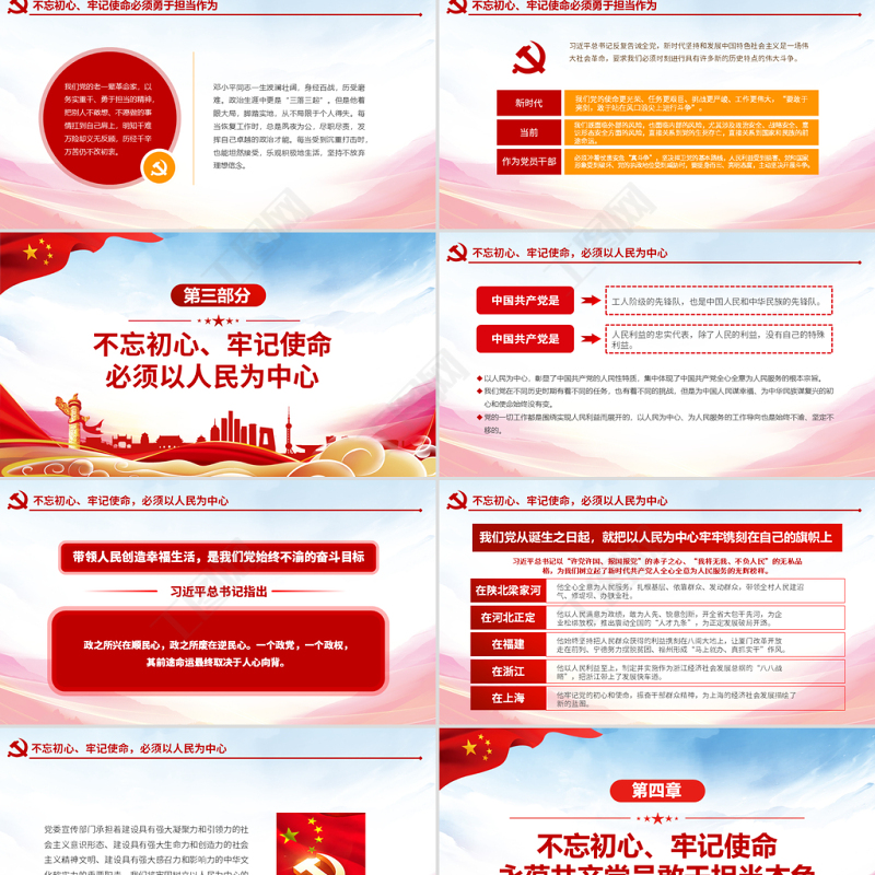 不忘初心、牢記使命,必須以人民為中心我們黨從誕生之日起,就把以人民為中心牢牢鐫刻在自己的旗幟上習近平總書記以“許黨許國、報國報黨”的赤子之心、“我將無我、不負人民”的無私品格,為我們樹立起了新時代共產黨人全心全意為人民服務的光輝榜樣。在陜北梁家河在河北正定在福建在浙江在上海
