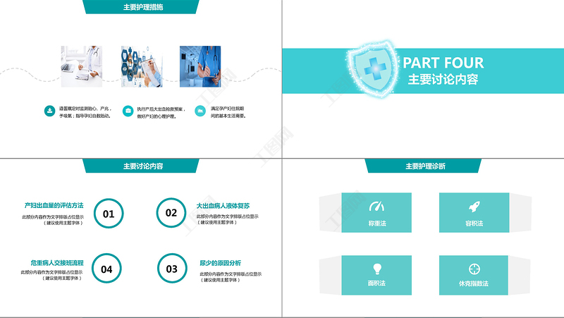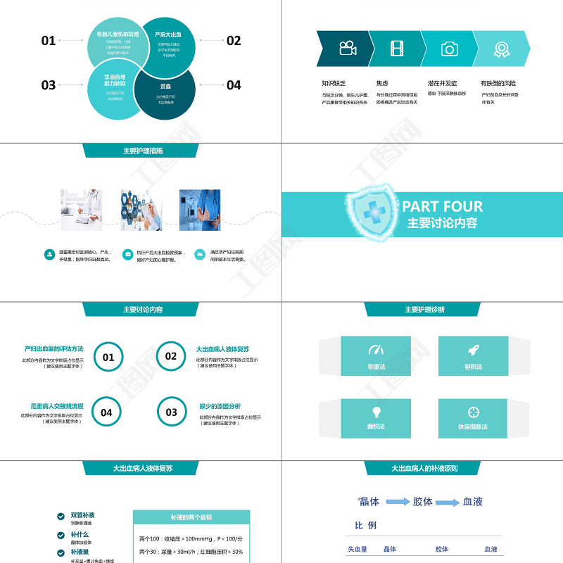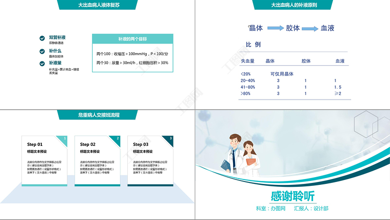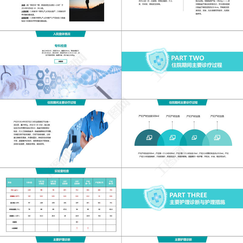 <p>醫院病例討論PPT模板科室:辦圖網 匯報人:設計部</p><br><p></p><br><p></p><br><p>患者基本信息性別:女工作:職員醫保:職工醫保家庭:社會支持系統良好主訴:因“停經38+6周,陰道血性分泌物1+小時”于2014年5月6日 14:30入院。入院診斷:1.妊娠38+6周孕2產0LO先兆臨產;2.妊娠合并甲狀腺功能減退。出院診斷:1.妊娠39周孕2產1LOA順產2.產后出血 3.胎盤粘連 4.妊娠合并甲狀腺功能減退。</p><br><p>患者基本信息既往病史孕半年前檢查發現并診斷甲狀腺功能減退,孕期一直口服優甲樂,余無特殊;2007年8月行人流一次;無食物、藥物過敏史;個人史、月經史、家族史無特殊。現病史曾于孕14+2周出現陰道流血,約10ml,予以地屈孕酮保胎治療;孕17+5周陰道有少量血性分泌物。孕期規律產檢:HBsAg(+),孕中期胎盤下緣達到宮頸內口,孕36周彩超提示胎盤下緣距宮頸內口3.4cm。孕晚期無陰道流血、流液,無頭昏眼花等癥狀,無皮膚瘙癢等。</p><br><p>入院查體情況</p><br><p></p><br><p>住院期間主要診療過程產婦于2014年5月7日2:18在會陰側切下分娩一活女嬰,重2980g,評分10-10-10分;胎兒娩出后20分鐘累積出血200ml,胎盤與宮腔部分粘連,行人工剝離胎盤術,胎盤胎膜娩出不完整,在B超引導下鉗夾清宮,子宮下段收縮差,立即建立靜脈雙通道,并通知醫生,持續雙合診按摩子宮,遵醫囑予欣母沛、縮宮素促進子宮收縮,加快補液速度,急查血常規、凝血項等。</p><br><p>住院期間主要診療過程產婦產時出血500ml產婦產時出血產婦產時出血產婦產時出血產婦產時出血500ml,產后第一個1小時400ml,產后2第二個小時出血10ml,產后2小時累積失血共計910ml。產婦產后2小時返回病房,子宮收縮好,陰道流血少,保留尿管暢。遵醫囑行一級護理,予抗炎、補液、輸血等治療。</p><br><p>實驗室檢查</p><br><p></p><br><p>主要護理診斷有胎兒受傷的危險與妊娠后期、分娩過程中胎兒可能發生宮內異常有關產后大出血主要與胎兒娩出后子宮下段收縮不良有關生活自理能力缺陷與分娩及產后大出血有關貧血與分娩及產后大出血有關</p><br><p>主要護理診斷知識缺乏與缺乏分娩、新生兒護理、產后康復等相關知識有關焦慮與分娩過程中宮縮引起的疼痛及產后出血有關潛在并發癥感染 下肢深靜脈血栓有跌倒的風險產婦貧血及長時間臥床有關</p><br><p>主要護理措施遵醫囑定時監測胎心、產兆,予吸氧;指導孕婦自數胎動。執行產后大出血搶救預案,做好產婦的心理護理。滿足孕產婦住院期間的基本生活需要。</p><br><p></p><br><p>主要討論內容01020304</p><br><p>主要護理診斷稱重法容積法面積法休克指數法</p><br><p>大出血病人液體復蘇</p><br><p>大出血病人的補液原則</p><br><p>危重病人交接班流程</p><br><p>感謝聆聽科室:辦圖網 匯報人:設計部</p><br>