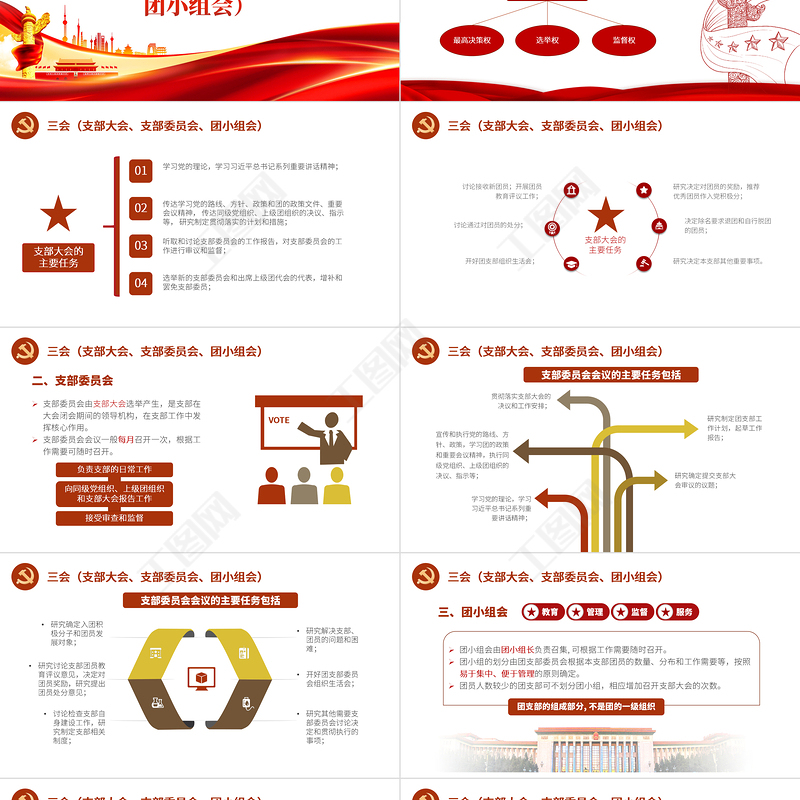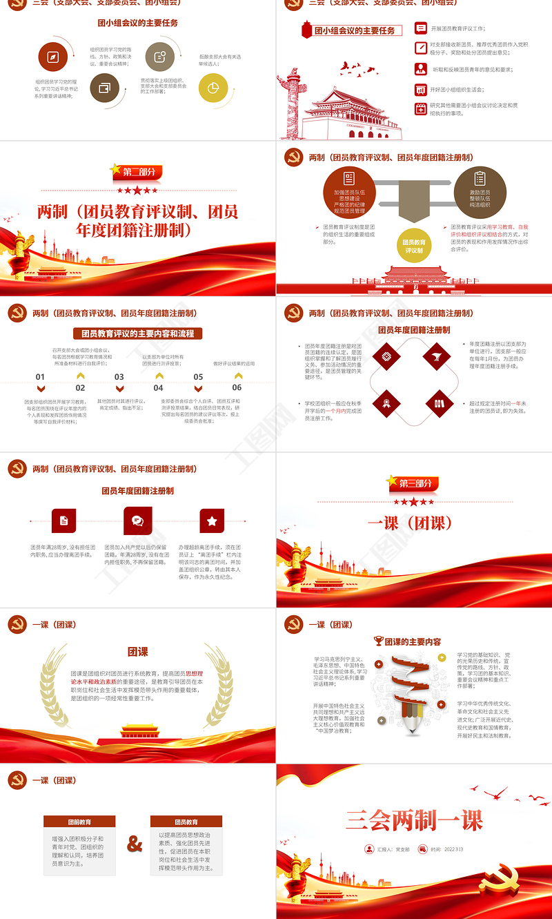 <p>2022年政府工作報告歸納解讀三會兩制一課</p><br><p>前言2月22日,團中央書記處第一書記秦宜智要求,以嚴、實作風抓好“一學一做”教育實踐各項任務落實。在組織生活方面,以團支部為基本單位,以“三會兩制一課”等團員教育管理制度為基本依據,集中開展好組織生活會、入團儀式和評選表彰工作,加強和整頓規范基層組織。三會兩制一課”是指支部大會、支部委員會、團小組會、團員教育評議制度、團員年度團籍注冊制度和團課,是團的組織生活的基本制度。</p><br><p>兩制(團員教育評議制、團員年度團籍注冊制)3三會(支部大會、支部委員會、團小組會)1一課(團課)4</p><br><p>三會(支部大會、支部委員會、團小組會)</p><br><p>支部大會是指由團的支部委員會召集的支部全體團員參加的會議。支部大會一般每季度召開一次, 根據工作需要可隨時召開。一、支部大會支部團員大會最高決策權選舉權監督權三會(支部大會、支部委員會、團小組會)</p><br><p>01020304學習黨的理論,學習習近平總書記系列重要講話精神;傳達學習黨的路線、方針、政策和團的政策文件、重要會議精神, 傳達同級黨組織、上級團組織的決議、指示等, 研究制定貫徹落實的計劃和措施;聽取和討論支部委員會的工作報告,對支部委員會的工作進行審議和監督;選舉新的支部委員會和出席上級團代會的代表,增補和罷免支部委員;010203040102三會(支部大會、支部委員會、團小組會)</p><br><p>研究決定對團員的獎勵,推薦優秀團員作入黨積極分;決定除名要求退團和自行脫團的團員;研究決定本支部其他重要事項。 討論接收新團員;開展團員教育評議工作; 討論通過對團員的處分; 開好團支部組織生活會;支部大會的主要任務三會(支部大會、支部委員會、團小組會)</p><br><p>支部委員會由支部大會選舉產生,是支部在大會閉會期間的領導機構,在支部工作中發揮核心作用。支部委員會會議一般每月召開一次,根據工作需要可隨時召開。二、支部委員會VOTE三會(支部大會、支部委員會、團小組會)</p><br><p>研究確定提交支部大會審議的議題;研究制定團支部工作計劃,起草工作報告;貫徹落實支部大會的決議和工作安排;宣傳和執行黨的路線、方針、政策,學習團的政策和重要會議精神,執行同級黨組織、上級團組織的決議、指示等;學習黨的理論,學習習近平總書記系列重要講話精神;三會(支部大會、支部委員會、團小組會)</p><br><p>研究確定入團積極分子和團員發展對象;研究討論支部團員教育評議意見,決定對團員獎勵,研究提出團員處分意見;討論檢查支部自身建設工作,研究制定支部相關制度;研究解決支部、團員的問題和困難;開好團支部委員會組織生活會;研究其他需要支部委員會討論決定和貫徹執行的事項;三會(支部大會、支部委員會、團小組會)</p><br><p>團小組會由團小組長負責召集,?可根據工作需要隨時召開。?團小組的劃分由團支部委員會根據本支部團員的數量、分布和工作需要等,按照易于集中、便于管理的原則確定。團員人數較少的團支部可不劃分團小組,相應增加召開支部大會的次數。三、團小組會團支部的組成部分, 不是團的一級組織三會(支部大會、支部委員會、團小組會)</p><br><p> 組織團員學習黨的理論, 學習習近平總書記系列重要講話精神; 組織團員學習黨的路線、方針、政策和決議、重要會議精神;貫徹落實上級團組織、支部大會和支部委員會的工作部署; 醞釀支部大會有關選舉候選人;團小組會議的主要任務三會(支部大會、支部委員會、團小組會)</p><br><p> 開展團員教育評議工作;對支部接收新團員、推薦優秀團員作入黨積極分子、獎勵和處分團員提出意見; 聽取和反映團員青年的意見和要求;開好團小組組織生活會;研究其他需要團小組會議討論決定和貫徹執行的事項。團小組會議的主要任務三會(支部大會、支部委員會、團小組會)</p><br><p>兩制(團員教育評議制、團員年度團籍注冊制)</p><br><p>兩制(團員教育評議制、團員年度團籍注冊制)</p><br><p>兩制(團員教育評議制、團員年度團籍注冊制)</p><br><p>團員年度團籍注冊制團員年度團籍注冊是對團員團籍的連續認定,是團組織掌握和了解團員履行義務、參加活動情況的重要途徑,是團員管理的關鍵環節。年度團籍注冊以團支部為單位進行,團支部一般應在每年1月份,為團員辦理年度團籍注冊手續。學校團組織一般應在秋季開學后的一個月內完成團員注冊工作。?超過規定注冊時間一年未注冊的團員證, 即為失效。兩制(團員教育評議制、團員年度團籍注冊制)</p><br><p>團員年度團籍注冊制團員加入共產黨以后仍保留團籍,年滿28周歲, 沒有在團內擔任職務, 不再保留團籍。團員年滿28周歲, 沒有擔任團內職務, 應當辦理離團手續。辦理超齡離團手續,須在團員證上 “離團手續”欄內注明該同志的離團時間,并加蓋團組織公章,轉由其本人保存,作為永久性紀念。兩制(團員教育評議制、團員年度團籍注冊制)</p><br><p>一課(團課)</p><br><p>團課是團組織對團員進行系統教育,提高團員思想理論水平和政治素質的重要途徑,是教育引導團員在本職崗位和社會生活中發揮模范帶頭作用的重要載體,是團組織的一項經常性重要工作。團課一課(團課)</p><br><p> 學習馬克思列寧主義、毛澤東思想、中國特色社會主義理論體系, 學習習近平總書