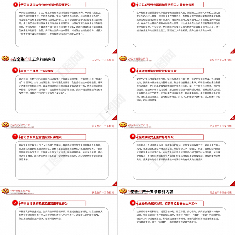 15注意調動各方面積極性,提倡互相協助、相互尊重、齊心合力,共同解決好面對的復雜問題。各級監管部門要注意從實際出發,處理好“紅燈”“綠燈”“黃燈”之間的關系,使各項工作協調有序推進,引導形成良好市場預期。各級黨委政府要把握好政策基調,堅持穩中求進,善于“彈鋼琴”,高質量統籌做好各方面工作。 安全生產十五條措施內容