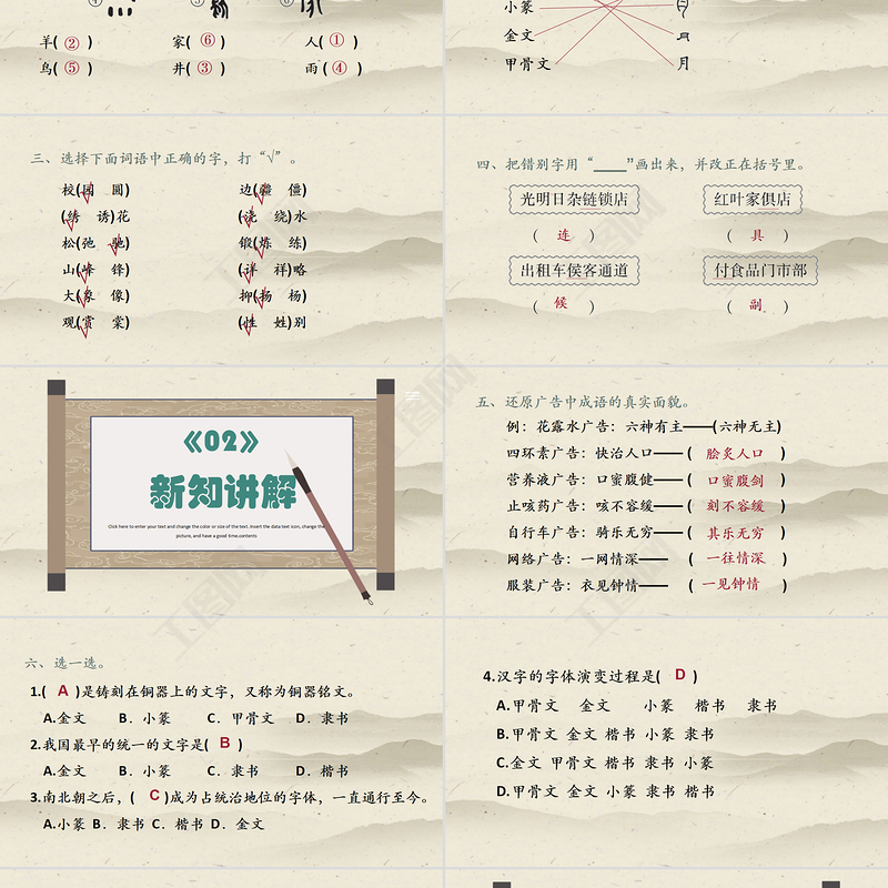 4.漢字的字體演變過(guò)程是( ) A.甲骨文 金文 小篆 楷書 隸書 B.甲骨文 金文 楷書 小篆 隸書 C.金文 甲骨文 楷書 隸書 小篆 D.甲骨文 金文 小篆 隸書 楷書D