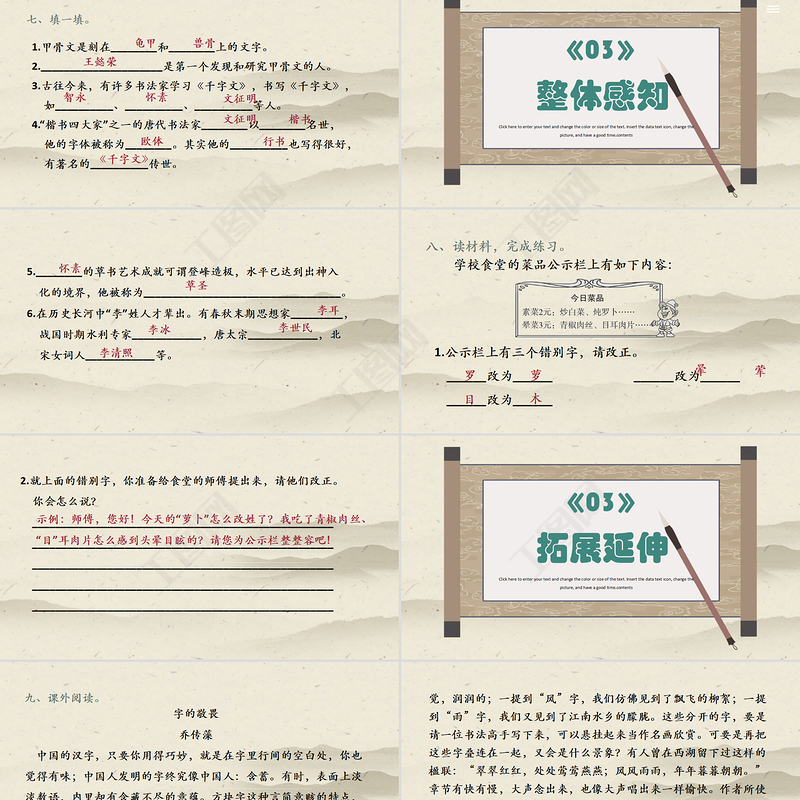 七、填一填。1.甲骨文是刻在________和________上的文字。 2._____________________是第一個(gè)發(fā)現(xiàn)和研究甲骨文的人。 3.古往今來(lái),有許多書法家學(xué)習(xí)《千字文》,書寫《千字文》, 如__________、__________、__________等人。 4.“楷書四大家”之一的唐代書法家________以________名世, 他的字體被稱為________。其實(shí)他的__________也寫得很好, 有著名的__________傳世。龜甲獸骨王懿榮智永懷素文征明文征明楷書歐體行書《千字文》