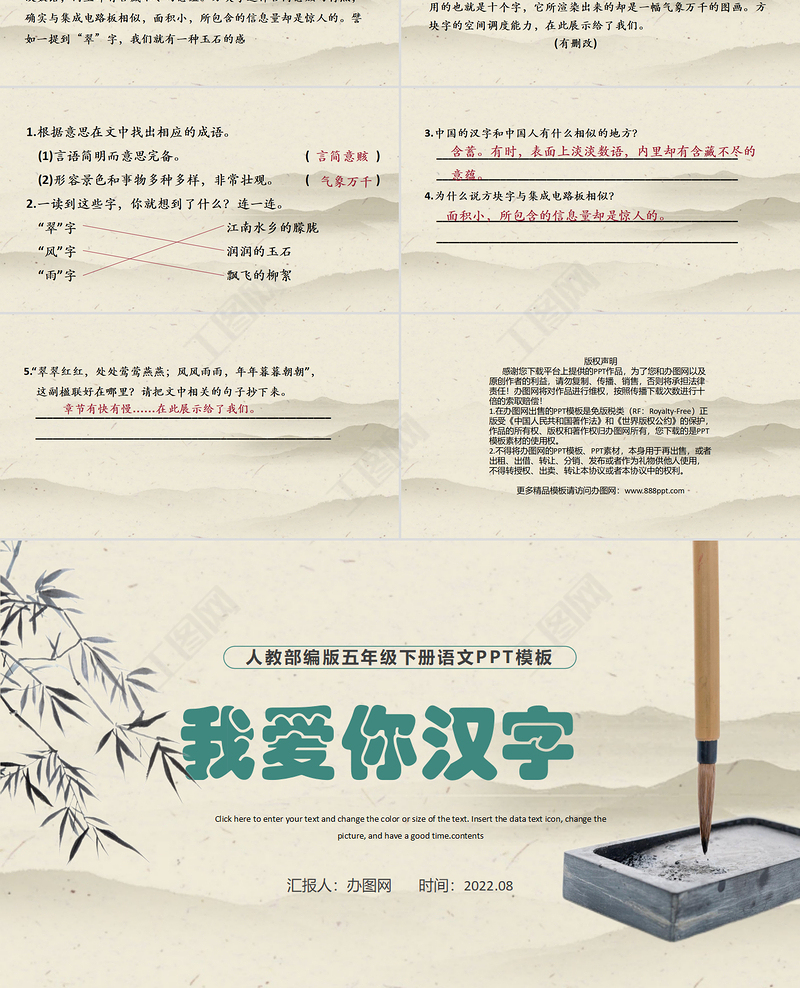 Click here to enter your text and change the color or size of the text. Insert the data text icon, change the picture, and have a good time.contents人教部編版五年級(jí)下冊(cè)語(yǔ)文PPT模板我愛你漢字匯報(bào)人:辦圖網(wǎng) 時(shí)間:2022.08
