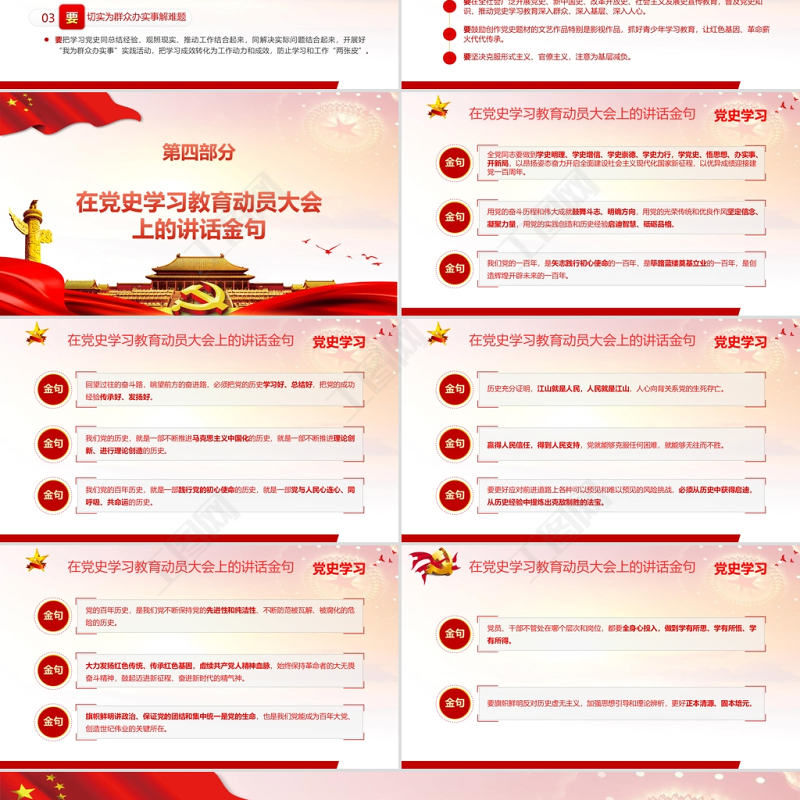 <p>8090 講黨史</p><br><p>黨史學習教育動員大會2月20日上午在北京召開。中共中央總書記、國家主席、中央軍委主席**出席會議并發表重要講話。他強調,在全黨開展黨史學習教育,是黨中央立足黨的百年歷史新起點、統籌中華民族偉大復興戰略全局和世界百年未有之大變局、為動員全黨全國滿懷信心投身全面建設社會主義現代化國家而作出的重大決策。全黨同志要做到學史明理、學史增信、學史崇德、學史力行,學黨史、悟思想、辦實事、開新局,以昂揚姿態奮力開啟全面建設社會主義現代化國家新征程,以優異成績迎接建黨一百周年。</p><br><p></p><br><p>第一部分闡述黨史學習教育重大意義</p><br><p>闡述黨史學習教育重大意義</p><br><p>強調1我們黨歷來重視黨史學習教育,注重用黨的奮斗歷程和偉大成就鼓舞斗志、明確方向,用黨的光榮傳統和優良作風堅定信念、凝聚力量,用黨的實踐創造和歷史經驗啟迪智慧、砥礪品格。2黨的十八大以來,黨中央高度重視學習黨的歷史,提出了一系列要求。3在慶祝我們黨百年華誕的重大時刻,在“兩個一百年”奮斗目標歷史交匯的關鍵節點,在全黨集中開展黨史學習教育,正當其時,十分必要。闡述黨史學習教育重大意義</p><br><p>我們黨的一百年矢志踐行初心使命的一百年篳路藍縷奠基立業的一百年創造輝煌開辟未來的一百年闡述黨史學習教育重大意義</p><br><p>三個重大意義即三個必然要求第一是牢記初心使命、推進中華民族偉大復興歷史偉業的必然要求第二是堅定信仰信念、在新時代堅持和發展中國特色社會主義的必然要求第三是推進黨的自我革命、永葆黨的生機活力的必然要求闡述黨史學習教育重大意義</p><br><p>第二部分部署黨史學習教育的重點內容</p><br><p>從五個方面部署教育引導全黨從黨的非凡歷程中領會馬克思主義是如何深刻改變中國、改變世界的,感悟馬克思主義的真理力量和實踐力量,深化對中國化馬克思主義既一脈相承又與時俱進的理論品質的認識,特別是要結合黨的十八大以來黨和國家事業取得歷史性成就、發生歷史性變革的進程,深刻學習領會新時代黨的創新理論,堅持不懈用黨的創新理論最新成果武裝頭腦、指導實踐、推動工作。強調部署黨史學習教育的重點內容黨史學習</p><br><p>教育引導全黨胸懷中華民族偉大復興戰略全局和世界百年未有之大變局,樹立大歷史觀,從歷史長河、時代大潮、全球風云中分析演變機理、探究歷史規律,提出因應的戰略策略,增強工作的系統性、預見性、創造性。指出部署黨史學習教育的重點內容黨史學習</p><br><p>教育引導全黨深刻認識黨的性質宗旨,堅持一切為了人民、一切依靠人民,始終把人民放在心中最高位置、把人民對美好生活的向往作為奮斗目標,推動改革發展成果更多更公平惠及全體人民,推動共同富裕取得更為明顯的實質性進展,把14億中國人民凝聚成推動中華民族偉大復興的磅礴力量。指出部署黨史學習教育的重點內容黨史學習</p><br><p>教育引導全黨大力發揚紅色傳統、傳承紅色基因,賡續共產黨人精神血脈,始終保持革命者的大無畏奮斗精神,鼓起邁進新征程、奮進新時代的精氣神。指出部署黨史學習教育的重點內容黨史學習</p><br><p>教育引導全黨從黨史中汲取正反兩方面歷史經驗,堅定不移向黨中央看齊,不斷提高政治判斷力、政治領悟力、政治執行力,自覺在思想上政治上行動上同黨中央保持高度一致,確保全黨上下擰成一股繩,心往一處想、勁往一處使。強調部署黨史學習教育的重點內容黨史學習</p><br><p>第三部分對黨史學習教育提出工作要求</p><br><p>對黨史學習教育提出工作要求黨史學習要加強組織領導要樹立正確黨史觀要切實為群眾辦實事解難題要注重方式方法創新</p><br><p>對黨史學習教育提出工作要求黨史學習加強組織領導各級黨委(黨組)要承擔主體責任,主要領導同志要親自抓、率先垂范,成立領導機構,切實把黨中央部署和要求落到實處。中央黨史學習教育領導小組要加強指導,省區市黨委和行業系統主管部門黨組(黨委)要加強對所屬地區、部門和單位的督導檢查。黨員、干部不管處在哪個層次和崗位都要全身心投入,做到學有所思、學有所悟、學有所得。</p><br><p>對黨史學習教育提出工作要求黨史學習樹立正確黨史觀要堅持以我們黨關于歷史問題的兩個決議和黨中央有關精神為依據,準確把握黨的歷史發展的主題主線、主流本質,正確認識和科學評價黨史上的重大事件、重要會議、重要人物。要旗幟鮮明反對歷史虛無主義,加強思想引導和理論辨析,更好正本清源、固本培元。切實為群眾辦實事解難題要把學習黨史同總結經驗、觀照現實、推動工作結合起來,同解決實際問題結合起來,開展好“我為群眾辦實事”實踐活動,把學習成效轉化為工作動力和成效,防止學習和工作“兩張皮”。</p><br><p>對黨史學習教育提出工作要求黨史學習注重方式方法創新</p><br><p>第四部分在黨史學習教育動員大會上的講話金句</p><br><p>在黨史學習教育動員大會上的講話金句黨史學習</p><br><p>在黨史學習教育動員大會上的講話金句黨史學習</p><br><p>在黨史學習教育動員大會上的講話金句黨史學習</p><br><p>在黨史學習教育動員大會上的講話金句黨史學習</p><br><p>在黨史學習教育動員大會上的講話金句黨史學習</p><br><p>感謝聆聽</p><br>