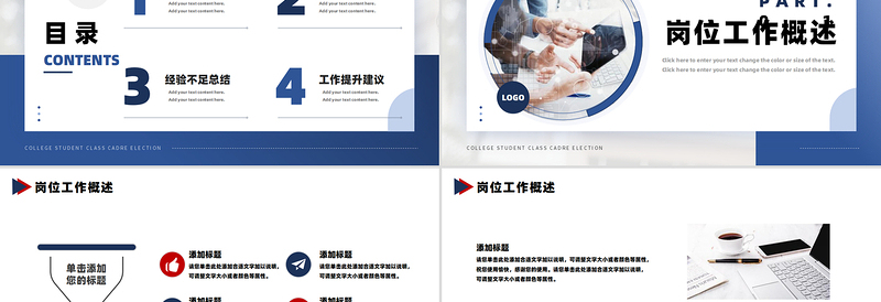 COLLEGE STUDENT CLASS MONITOR ELECTION1234崗位工作概述Add your text content here. Add your text content here.重點工作進度Add your text content here. Add your text content here.經驗不足總結Add your text content here. Add your text content here.工作提升建議Add your text content here. Add your text content here.CONTENTS目 錄
