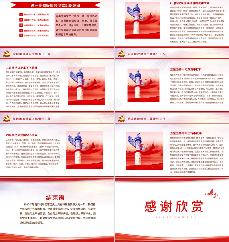 結(jié)束語 2020年是我們黨和國家歷史上具有特殊重要意義的一年,我們將嚴(yán)格按照十九大的指示,全面落實各項工作,堅守理想信念、努力進取,在政治上嚴(yán)格要求、在業(yè)務(wù)上不斷求精,在思想上不斷凈化,提升黨建工作水平,切實發(fā)揮黨的基層組織戰(zhàn)斗堡壘作用,為組織發(fā)展提供堅強的政治保障。