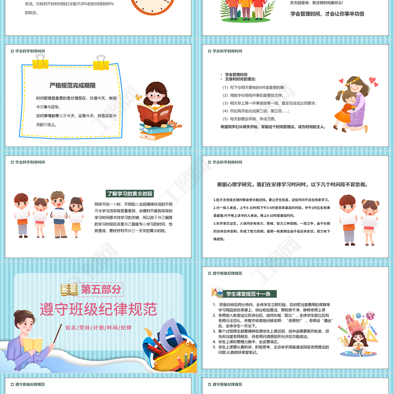 學會科學利用時間1.肚子太飽或太餓時都會使頭腦遲鈍,要讓學?知道,這些時間不適合?來學習。2.對?般?來說,上午8-10時和下午3-6時是效率最?的時段,中午1時左右和黃昏最差;對于晚上讀書的?來說,晚上8-10時是最佳時間。3.科學家已證實,?體內存有體?、情緒、智?三種周期。?周之中,由于長期的雙休?休息制,形成了智?周期,星期?和星期五由于臨近休息?,智?有下降趨勢。根據心理學研究,我們在安排學習時間時,以下幾個時間段不容忽視。