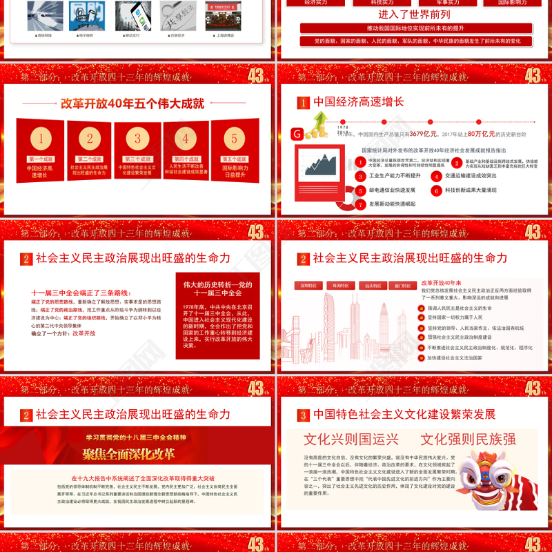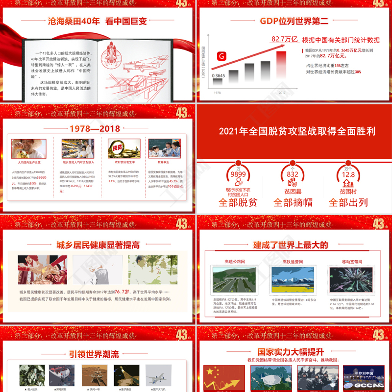 <p>改革開放43年1978——2021學黨史 悟思想 辦實事 開新局 黨政部門/國有企業/黨支部/團支部2021年建黨100周年黨史學習教育專題輔導</p><br><p>1978年年末,中國共產黨十一屆三中全會召開。會議高度評價了關于實踐是檢驗真理的唯一標準的討論,重新確立“解放思想、實事求是”的思想路線,作出了改革開放這一“決定當代中國命運的關鍵抉擇”。從1978年再次出發的中國,開始締造震撼世界的“中國奇跡”。1992年初春,新的改革瓶頸亟待破局。88歲的**走向了南中國,以其巨大的政治氣魄和寬闊的歷史視野,發表了著名的南方談話。“姓社”“姓資”的辯證解讀、“社會主義的本質是解放生產力”的高超提煉,推動改革再入歷史新境。</p><br><p></p><br><p>01改革開放四十三年的歷史進程THE FIRST CONTENT</p><br><p>改革開放經歷的5個階段改革開放經歷的5個階段1978 2021</p><br><p>▲十一屆三中全會從以階級斗爭為綱轉變到以經濟建設為中心從封閉轉變到擴大開放從固守陳規轉變到大膽改革這一時期是中國社會主義改革的理論創新和思想準備階段 </p><br><p>這一階段的改革總體上是處于“摸著石頭過河”的狀態,改革不是系統推進,基本上是摸索著解決一個又一個問題。這一時期,改革呈現三個新特點這一時期,改革呈現三個新特點</p><br><p>以1992年初**南方談話為標志,我國改革開放進入建立社會主義市場經濟體制的新階段。**視察南方談話,發生在1992年1月18日—2月21日。當時已正式告別中央領導崗位的黨的第二代領導核心、改革開放的總設計師**,以普通黨員的身份,憑著對黨和人民偉大事業的深切期待,先后赴武昌、深圳、珠海和上海視察,沿途發表了重要談話。3月26日,《深圳特區報》率先發表了“東方風來滿眼春——**同志在深圳紀實”的重大社論報道,并集中闡述了**南方談話的要點內容。南方談話標志著中國改革進入新的階段。南方談話最主要是加快改革。</p><br><p>2000年10月中共十五屆五中全會提出,從新世紀開始我國將進入全面建設小康社會,加快推進社會主義現代化的新的發展階段。這一階段是在改革開放取得偉大成就的基礎上,面對新形勢、新矛盾、新問題,黨和國家謀求改革和發展:</p><br><p>黨的十八大以來,以XXXXXX的黨中央提出和推進全面深化改革,聚焦完善和發展中國特色社會主義制度、推進國家治理體系和治理能力現代化的總目標,堅決破除各方面體制機制弊端,書寫了在新形勢下將改革開放不斷推向前進的歷史新篇章。</p><br><p>02改革開放四十三年的歷史進程THE SECOND CONTENT</p><br><p>滄海桑田40年 看中國巨變滄海桑田40年 看中國巨變 一個13億多人口的超大規模經濟體,40年改革開放劈波斬浪,實現了起飛、轉型到跨越的“驚人一躍”,在人類社會發展史上被世人稱作“中國奇跡”。 這場規模空前宏大、影響前所未有的發展偉業,是中國人民創造的偉大傳奇。</p><br><p>GDP位列世界第二GDP位列世界第二根據中國有關部門統計數據</p><br><p>1978—20181978—2018人均國內生產總值城鄉居民人均可支配收入農村貧困發生率教育事業人均國內生產總值從1978年的385元增長到2017年的59660元,年均增長約9.5%,已經達到中等偏上收入國家水平;城鎮居民人均可支配收入和農村居民人均可支配收入分別從1978年的 343.4 元、133.6元提高到2017年的36396元、13432元;農村貧困發生率從1978年的97.5%大幅下降到2017年的3.1%,遠低于世界平均水平;居民受教育程度不斷提高,九年義務教育全面普及,高等教育毛入學率2017年達到 45.7%,高出世界平均水平近10個百分點;</p><br><p>現行標準下農村貧困人口全部脫貧貧困縣全部摘帽貧困村全部出列2021年全國脫貧攻堅戰取得全面勝利</p><br><p> 城鄉居民健康顯著提高 城鄉居民健康顯著提高 城鄉居民健康狀況顯著改善,居民平均預期壽命2017年達到76.7歲,高于世界平均水平……我國已提前實現了聯合國千年發展目標中關于健康的指標,居民健康水平走在發展中國家前列。</p><br><p>建成了世界上最大的建成了世界上最大的高速公路網總規模約8.5萬公里,其中主線6.8萬公里,地區環線、聯絡線等其它路線約1.7萬公里,是世界上規模最大的高速公路系統。高鐵運營網中國高速鐵路營業里程達1.8萬多公里,是全球規模最大的。移動寬帶網中國互聯網寬帶接入用戶數達到2.86 億戶,中國網民規模達到7.51億,手機網民達到7.24億。</p><br><p>引領世界潮流引領世界潮流 ▲ 載人航天 ▲深海探測 ▲ 天問一號 ▲量子通信 ▲國產大飛機 ▲高鐵網絡 ▲電子商務 ▲移動支付 ▲共享經濟 ▲ 上海進博會</p><br><p>國家實力大幅提升國家實力大幅提升進入了世界前列我們黨團結帶領全國各族人民不懈奮斗,推動我國:</p><br><p>改革開放40年五個偉大成就改革開放40年五個偉大成就</p><br><p>中國經濟高速增長11978 20181978年,中國國內生產總值只有3679億元,2017年站上80萬億元的歷史新臺階 國家統計局對外發布的改革開放40年經濟社會發展成就報告指出1中國經濟總量躍居世界第二,經濟結構實現重大變革,發展的協調性和可持續性明顯提高2基礎產業和基礎設施跨越式發展,供給能力實現從短缺匱乏到豐富充裕的巨大轉變3工業生產能力不斷提升4交通運輸建設成效突出5郵電通信業快速發展6科技創新成果大量涌現7發展新動能快速崛起</p><br><p>社會主義民主政治展現出旺盛的生命力2十一屆三中