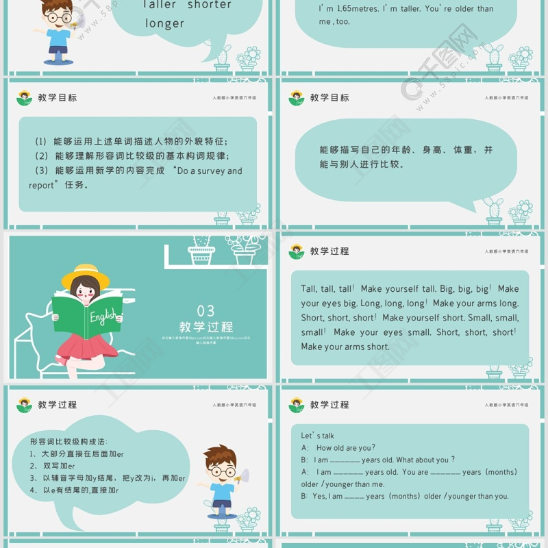 教學分析本部分學習的是形容詞的比較級形式:younger, older, taller, shorter, longer等。