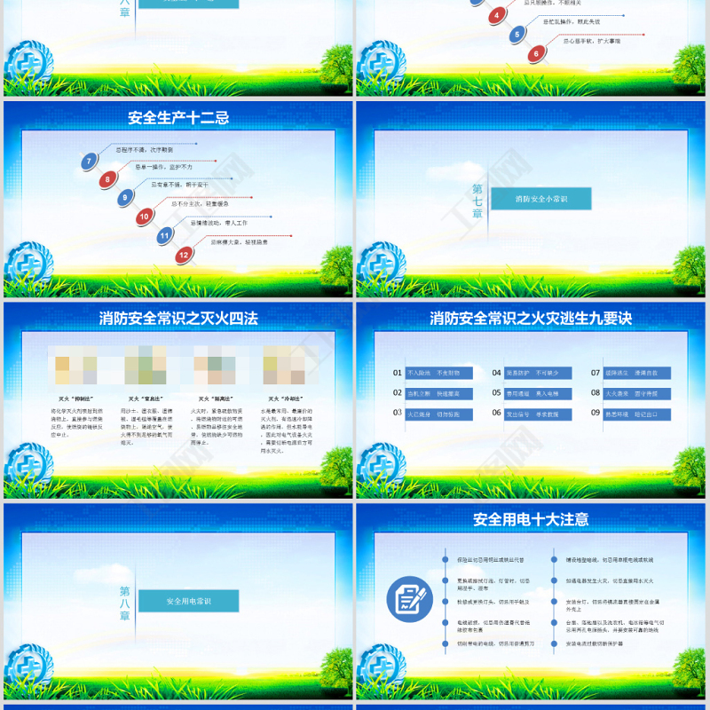 消防安全常識之火災逃生九要訣010203不入險地 不貪財物當機立斷 快速撤離火已燒身 切勿驚跑040506簡易防護 不可缺少善用通道 莫入電梯發出信號 尋求救援070809緩降逃生 滑繩自救大火襲來 固守待援熟悉環境 暗記出口