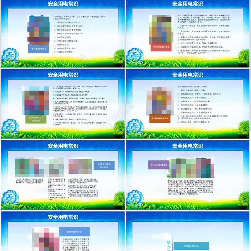 安全用電常識車間安全用電基本知識非電工不準拆裝、修理、加裝電氣設備和線路,發現破損的電線、開關、燈頭及插座應及時與電工聯系修理,不得帶故障運行。在操作閘刀開關、磁力開關時,必須將蓋蓋好,以免在短路時發生電弧或熔絲熔斷飛濺傷人。移動某些非固定安裝的電氣設備,如電風扇、照明燈、電焊機等時,必須先切斷電源再移動。導線要收撿好,不得在地面上拖來拖去,以免磨損。導線被物體軋住時,不要硬拉,防止將導線拉斷。打掃衛生、擦拭設備時,嚴禁用水沖洗或用濕布去擦拭,也不要用濕手和金屬物去扳帶電的電氣開關,以免發生短路和觸電事故。不得將工件等重物壓在導線上,防止軋斷導線發生觸電。不準私用電氣設備和燈泡取暖。熔絲熔斷,不準調換容量不符的熔絲。不準擅自移動電氣安全標志、圍欄等安全設施。不準使用檢修中機器的電氣設備。
