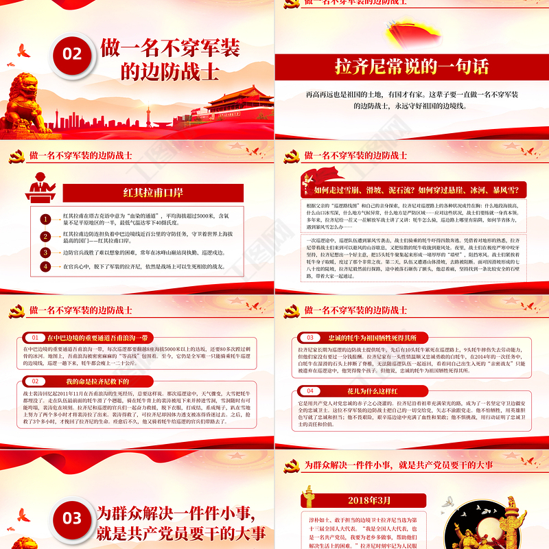 <p>——追記“時代楷模”拉齊尼·巴依卡—— 某某黨委學習小組 ——</p><br><p>“花兒為什么這樣紅,為什么這樣紅?紅得好像、紅得好像燃燒的火……它是用了青春的血液來澆灌。”這首塔吉克族民歌《花兒為什么這樣紅》,是共產黨員拉齊尼·巴依卡生前常常哼唱的歌。歌中詠唱的鮮花,象征著共產黨員身上的愛國、忠誠、為民和大無畏的精神,給了他戰勝一切艱難險阻的力量。拉齊尼是一位塔吉克族退伍邊防戰士,是全國勞動模范、全國愛國擁軍模范、全國人大代表,是從爺爺和父親手里接過神圣職責、與解放軍一起守衛祖國邊防的家中第三代護邊英雄!2021年1月4日,為救落入冰湖中的兒童,41歲的他英勇獻身,譜寫出一曲高亢的英雄壯歌。前言</p><br><p>拉齊尼用41年的生命,詮釋了對偉大祖國的無限熱愛和對黨的絕對忠誠。他奉獻一生初心不改,不懼犧牲舍生取義,是堅定守衛邊疆安全的忠誠衛士,是堅決貫徹落實新時代黨的治疆方略的先鋒模范,在雪域高原澆灌出了又一朵永遠盛開的精神之花。2021年3月3日,中共中央宣傳部追授拉齊尼·巴依卡“時代楷模”稱號。2021年6月28日,在慶祝中國共產黨成立100周年之際,中共中央追授拉齊尼·巴依卡“全國優秀共產黨員”稱號。</p><br><p>目錄</p><br><p>01不能讓界碑移動哪怕一毫米</p><br><p>不能讓界碑移動哪怕一毫米不能讓界碑移動哪怕一毫米123“南湖紅色的光照亮帕米爾高原,在晨曦中,我祖父凱力迪別克露出笑顏……祖父和父親的精神鼓舞著我雄鷹般飛翔,我以鋼鐵般的意志,日夜巡邏在冰峰雪嶺間。”這是拉齊尼在朋友圈發布的最后一條動態。斯人已逝,精神永存。高聳入云的慕士塔格峰和艱險崎嶇的千里邊防線見證了拉齊尼一家三代守邊護邊的傳奇故事。拉齊尼的家鄉在塔什庫爾干塔吉克自治縣。這是一座邊境高原小城,位于新疆西南部的帕米爾高原東坡、喀喇昆侖山北麓、塔里木盆地西緣,與塔吉克斯坦、阿富汗、巴基斯坦三國接壤。</p><br><p>不能讓界碑移動哪怕一毫米從武警邊防部隊退役的拉齊尼成為一名護邊員,接過父親手中的接力棒,為紅其拉甫邊防線上的巡邏戰士做向導。同時接過來的,是父親手繪的“巡邏路線圖”和“不能讓界碑移動哪怕一毫米”的家訓。“巡邏路線圖”上,父親標注出巡邏路線上的險段、坡度、冰河溫度、宿營點、防衛野狼方法等;家訓里,蘊含了拉齊尼家深沉的守護祖國邊疆之責、守護鄉親安康之責、守護內心信念之責。2003年巡邏路線圖不能讓界碑移動哪怕一毫米</p><br><p>不能讓界碑移動哪怕一毫米紅其拉甫邊防連成立,哨卡建在海拔4300米的帕米爾高原上。這里雪崩、滑坡、泥石流等自然災害頻發,沒有經驗豐富的向導,巡邏隊伍寸步難行。拉齊尼的爺爺——牧民凱力迪別克·迪力達爾自告奮勇,給連隊義務當向導,和解放軍一起把界碑豎立在吾甫浪溝的點位上,成了新中國成立后的第一代護邊員。1972年,凱力迪別克把巡邊的接力棒交給了兒子巴依卡·凱力迪別克,他囑咐巴依卡說:“是解放軍把糧食、柴火、馬草和藥品送到咱們牧民的手里,讓我們過上了幸福的生活。你要接好我的班。”</p><br><p>不能讓界碑移動哪怕一毫米30多年巡邊路,巴依卡從青絲走到了白發,堅守了“邊防線在哪里,人就在哪里”的誓言。當地干部問起奉獻一生的巴依卡有什么要求時,巴依卡鄭重地說:“我唯一的愿望,就是加入中國共產黨。</p><br><p>不能讓界碑移動哪怕一毫米</p><br><p>不能讓界碑移動哪怕一毫米70多年</p><br><p>02做一名不穿軍裝的邊防戰士</p><br><p>做一名不穿軍裝的邊防戰士拉齊尼常說的一句話再高再遠也是祖國的土地,有國才有家。這輩子要一直做一名不穿軍裝的邊防戰士,永遠守好祖國的邊境線。</p><br><p>做一名不穿軍裝的邊防戰士紅其拉甫口岸123紅其拉甫在塔吉克語中意為“血染的通道”,平均海拔超過5000米,含氧量不足平原地區的一半,最低氣溫達零下40攝氏度。紅其拉甫邊防連擔負著中巴邊境線近百公里的守防任務,守衛著世界上海拔最高的國門——紅其拉甫口岸。邊防官兵戰勝了難以想象的困難,常年在冰峰山巔站崗執勤、巡邏戍邊。4在官兵心中,脫下了軍裝的拉齊尼,依然是戰場上可以生死相依的戰友。</p><br><p>做一名不穿軍裝的邊防戰士如何走過雪崩、滑坡、泥石流?如何穿過懸崖、冰河、暴風雪?根據父親的“巡邏路線圖”和自己的親身探索,拉齊尼對巡邏路上的各種狀況成竹在胸:什么地段海拔高,什么山口冰雪深,什么地方氣候異常,什么地方是嚴防區域……應對這些狀況,戰士們要練就一身真本領。多年來,拉齊尼給一茬又一茬解放軍戰士講了又講:牦牛怎么騎,巡邊路上哪里有陷阱,如何節省體力,遇到暴風雪怎么辦……一次巡邏途中,巡邏隊伍遭到暴風雪襲擊,戰士們騎乘的牦牛嚇得四散奔逃。憑借著對地形的熟悉,拉齊尼帶著戰士們來到可以避風的山谷歇息,又把驚散的牦牛收攏到避風處。夜里,戰士們在極度嚴寒中咬牙堅持,拉齊尼想出一個好主意,把15頭牦牛聚集起來形成一堵厚厚的“墻壁”,阻擋寒風。戰士們緊挨著牦牛身子取暖,度過了那個非常之夜。第二天,隊伍又遭遇山體滑坡,去路被阻斷。面對因滑坡形成的七八十度的陡坡,拉齊尼毅然前行探路,途中被落石砸傷了額頭,他忍著痛,堅持找到一條比較安全的石壁路,帶著大家一起通過。</p><br><p>做一名不