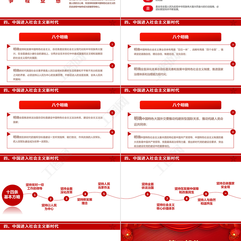 八個明確明確堅持和發展中國特色社會主義,總任務是實現社會主義現代化和中華民族偉大復興,在全面建成小康社會的基礎上,分兩步走在本世紀中葉建成富強民主文明和諧美麗的社會主義現代化強國;1明確新時代我國社會主要矛盾是人民日益增長的美好生活需要和不平衡不充分的發展之間的矛盾,必須堅持以人民為中心的發展思想,不斷促進人的全面發展、全體人民共同富裕;2