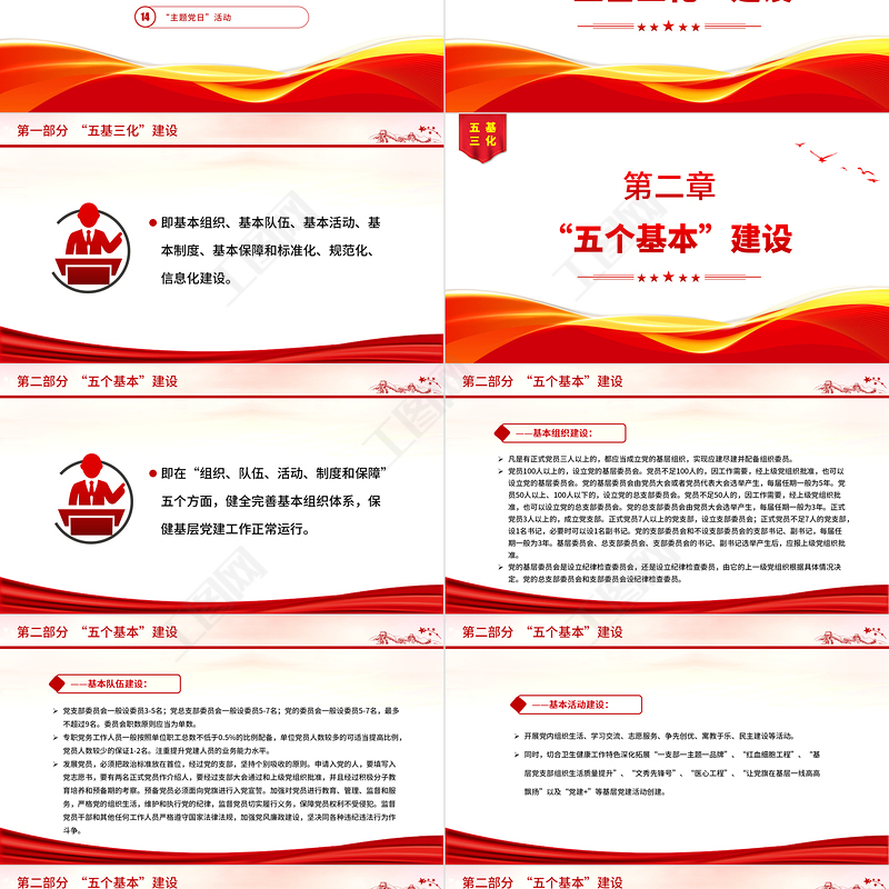 即基本組織、基本隊伍、基本活動、基本制度、基本保障和標準化、規范化、信息化建設。第一部分 “五基三化”建設