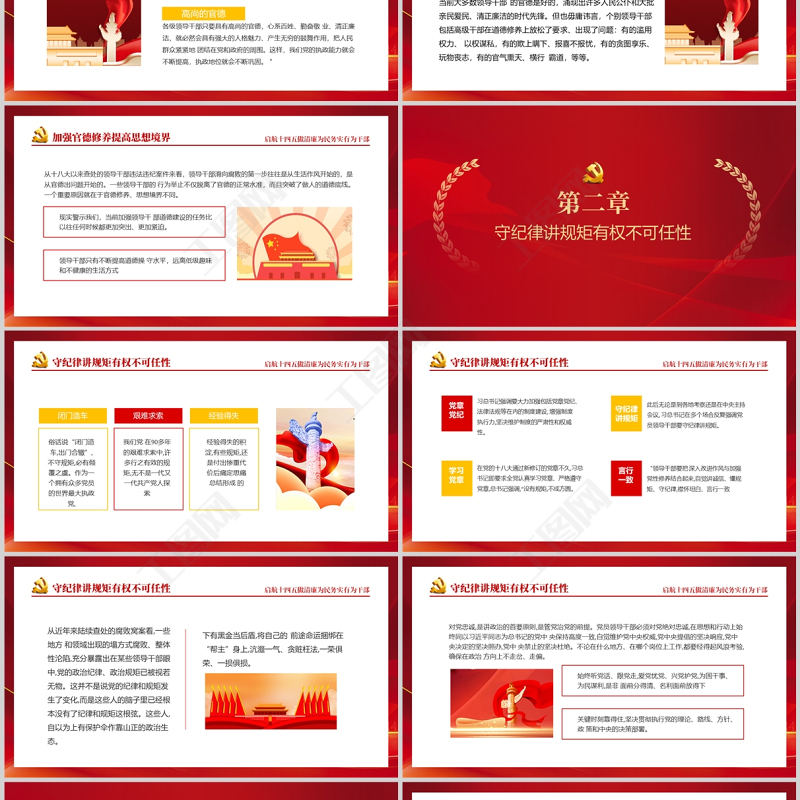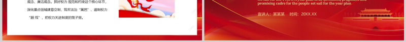 <p>啟航十四五做清廉為民務實有為干部set sail for the 14th five year plan to be an honest, pragmatic and promising cadre for the people set sail for the year plan宣講人:某某某 時間:20XX.XX</p><br><p>目 錄啟航十四五做清廉為民務實有為干部</p><br><p>加強官德修養提高思想境界</p><br><p>古人早就提出了“為政以德”的思想,并把修身正己作為齊家、 治國、平天下的前提,強調“其身正,不令而行;其身不正,雖令不從”。孔子認為:“為政以德,譬如北辰,居其所而眾星共之。”各級領導干部只要具有高尚的官德,心系百姓、勤奮敬 業、清正廉潔,就必然會具有強大的人格魅力、產生無窮的鼓舞作用,把人民群眾緊緊地 團結在黨和政府的周圍。這樣,我們黨的執政能力就會不斷提高,執政地位就會不斷鞏固。 ”為政以德高尚的官德</p><br><p>領導干部施政以德,正直清廉,忠于職守,多為人民做好事,黨和政府在人民群眾中的形象就會提升,公信力就會提高。應當說,當前大多數領導干部 的官德是好的,涌現出許多人民公仆和大批親民愛民、清正廉潔的時代先鋒。但也毋庸諱言,個別領導干部包括高級干部在道德修養上放松了要求、出現了問題:有的濫用權力、 以權謀私,有的欺上瞞下、報喜不報憂,有的貪圖享樂、玩物喪志,有的官氣熏天、橫行 霸道,等等。領導干部施政以德</p><br><p>從十八大以來查處的領導干部違法違紀案件來看,領導干部滑向腐敗的第一步往往是從生活作風開始的,是從官德出問題開始的。一些領導干部的 行為舉止不僅脫離了官德的正常水準,而且突破了做人的道德底線。一個重要原因就在于官德修養、思想境界不同。</p><br><p>守紀律講規矩有權不可任性</p><br><p></p><br><p></p><br><p>從近年來陸續查處的腐敗窩案看,一些地方 和領域出現的塌方式腐敗、整體性淪陷,充分暴露出在某些領導干部眼中,黨的政治紀律、政治規矩已被視若無物。這并不是說黨的紀律和規矩發生了變化,而是這些人的腦子里已經根 本沒有了紀律和規矩這根弦。這些人,自以為上有保護傘作靠山正的政治生態。下有黑金當后盾,將自己的 前途命運捆綁在“幫主”身上,沆瀣一氣、貪贓枉法,一榮俱榮、一損俱損。</p><br><p>對黨忠誠,是講政治的首要原則,是管黨治黨的前提。黨員領導干部必須對黨絕對忠誠,在思想和行動上始終同以習近平同志為總書記的黨中 央保持高度一致,自覺維護黨中央權威,黨中央提倡的堅決響應,黨中央決定的堅決照辦,黨中 央禁止的堅決杜絕。不論在什么地方、在哪個崗位上工作,都要經得起風浪考驗,確保在政治 方向上不走岔、走偏。</p><br><p>做忠誠干凈擔當的黨員干部</p><br><p>是習近平總書記在提出“三嚴三實”要求之后, 對作風建設作出的新概括、提出的新準則,彰顯了共產黨人的政治品格和價值追求。 對黨忠誠個人干凈敢于擔當</p><br><p>要正確看 待利與義的關系,算清腐敗七筆賬,算清“政治賬”,算清“經濟賬”,算清“名譽 賬”,算清“家庭賬”,算清“親倡導高尚正派、恬淡 健康的生活方式,做到慎言、慎行、慎權、慎獨、慎微、慎友,時刻防止“貪欲纏 身”</p><br><p>習近平總書記指出“擔當大小,體現著干部 的胸懷、勇氣、格調,有多大擔當才能干多大事業。”當前,我市xx事業快速發展,這就 要求xx系統各級領導干部勤于履責、勇于擔責、敢于負責,在敢于擔當中歷練提高,在真 抓實干中建功立業創造經得起實踐、人民、歷史檢驗的業績。要敢想敢做敢當,牢固樹 立責任重于泰山的意識,自覺消除私心雜念,堅持黨的原則第一、黨的事業第一、人民利益第一,面對大是大非敢于亮劍,面對矛盾敢于迎難而上</p><br><p></p><br><p>健全干部經常 性管理機制,加強對黨員干部的監督,讓干部時刻感到身邊有一把戒尺,腦中有盞“紅綠 燈”堅持黨規黨紀嚴于國家法律,通過剛性約束嚴格執紀,強化他律和自律結合、道德 教化和法治手段兼施,讓黨員干部心有所畏、言有所戒、行有所止。強化他律和自律結合、道德 教化和法治手段兼施,讓黨員干部心有所畏、言有所戒、行有所止。</p><br><p>管黨治黨,少數人靠覺悟,多數人靠制度。既要選對 人、用好人,又要堅持用制度管事管權管人,形成不想腐、不能腐、不敢腐的有效機制。 始終繃緊作風建設這根弦,“木魚”天天敲、“緊箍咒”天天念,持之以恒、久久為功, 推動xx系統黨風政風持續好轉。認真剖析十八大以來腐敗案件高發多發原因,強化法紀觀念、廉潔觀念。抓好權力 規范和約束這個核心環節,深化重點領域建章立制,筑牢法治“籬笆”、遏制權力“越 線”,把權力關進制度的籠子里。</p><br><p>啟航十四五做清廉為民務實有為干部set sail for the 14th five year plan to be an honest, pragmatic and promising cadre for the people set sail for the year plan宣講人:某某某 時間:20XX.XX</p><br>