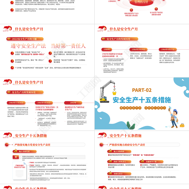 工圖網(wǎng)提供遵守安全生產(chǎn)法當好第一責任人PPT紅色大氣風2022安全生產(chǎn)月宣傳安全教育課件模板1供會員免費下載。更多精彩黨課PPT素材,盡在工圖網(wǎng)。