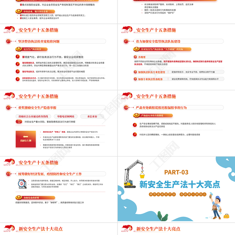 安全生產(chǎn)十五條措施2022安全生產(chǎn)月堅決整治執(zhí)法檢查寬松軟問題十一安全生產(chǎn)執(zhí)法檢查要理直氣壯,緊盯各類違法行為不放,督促企業(yè)徹底整改1強化精準執(zhí)法,按照省市縣三級執(zhí)法管理權(quán)限,確定各級管轄企業(yè)名單,明確重點檢查企業(yè)和重點執(zhí)法事項,突出對典型事故暴露出的嚴重違法行為,舉一反三加強執(zhí)法檢查2強化專業(yè)執(zhí)法,組織專家參與執(zhí)法過程,解決安全檢查查不出問題的難題3創(chuàng)新監(jiān)管執(zhí)法方式,大力推行異地交叉檢查,充分利用在線遠程巡查、用水用電監(jiān)測、電子封條等信息化手段,及時發(fā)現(xiàn)違法盜采、冒險作業(yè)等行為,對關(guān)停的礦山要停止供電,派人現(xiàn)場盯守或巡查,嚴防明停暗采4