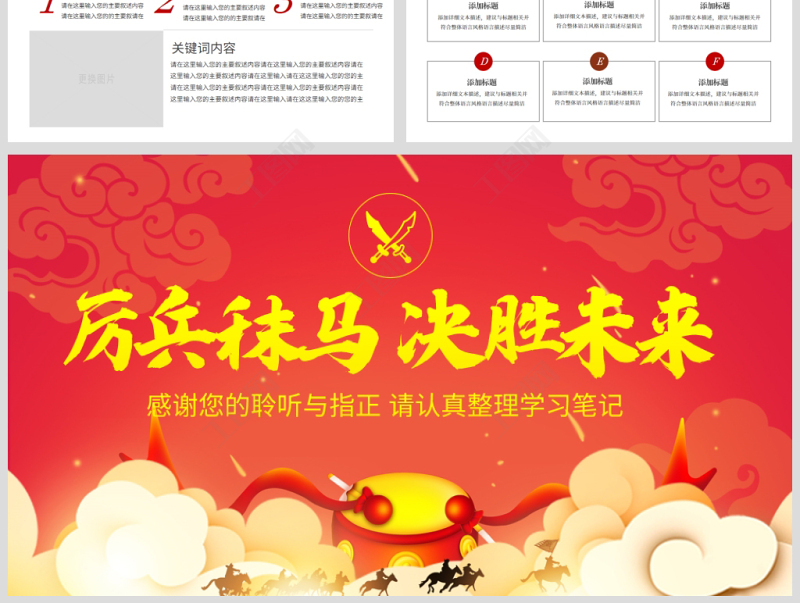 工圖網(wǎng)提供原創(chuàng)古代戰(zhàn)爭厲兵秣馬決勝未來員工激勵誓師大會PPT-版權可商用供會員免費下載。更多精彩黨課PPT素材,盡在工圖網(wǎng)。