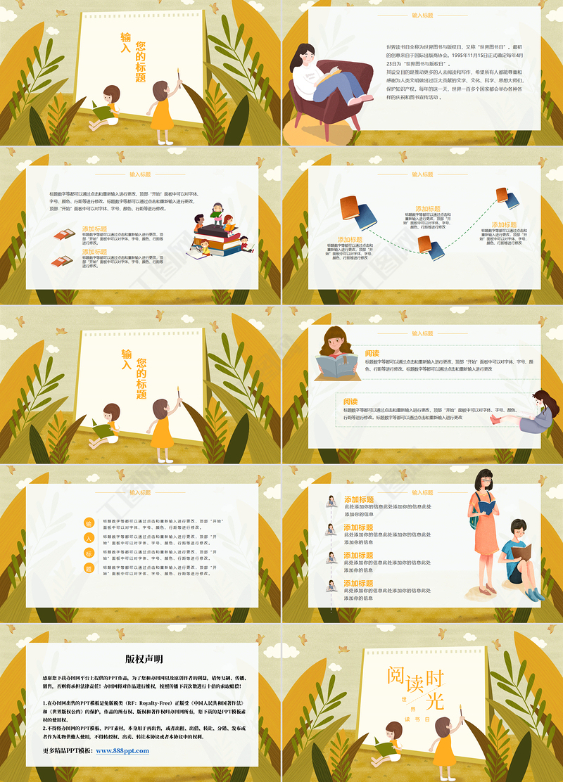 時間創意插畫風世界讀書日閱讀時光PPT模版
