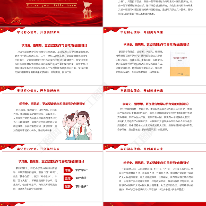 <p>請黨放心 強國有我</p><br><p>以新時代中國特色社會主義思想為指導,深入學習宣傳貫徹黨的十九大和十九屆二中、三中、四中全會精神,深入學習貫徹總書記關于安全生產重要論述,貫徹落實黨中央、國務院關于安全生產重大決策部署,著眼加強疫情防控常態化條件下安全生產和專項整治三年行動排查整治工作,推動各級樹牢安全發展理念,壓緊壓實安全生產責任,深入排查安全風險隱患,扎實推進問題整改,堅決遏制重特大事故發生,切實維護人民群眾生命財產安全。通過開展教育培訓、隱患曝光、問題整改、經驗推廣、案例警示、監督舉報、知識普及等既有聲勢又有實效的宣傳教育活動,增強全民安全意識,提升公眾安全素質,促進安全生產水平提升和安全生產形勢持續穩定好轉,不斷增強人民群眾獲得感、幸福感、安全感,為決勝全面建成小康社會、決戰脫貧攻堅營造穩定的安全生產環境。前言導讀</p><br><p>以史為鑒、開創未來,必須繼續推進馬克思主義中國化牢記初心使命、開創美好未來以史為鑒、開創未來,必須加快國防和軍隊現代化以史為鑒、開創未來,必須不斷推動構建人類命運共同體</p><br><p>牢記初心使命、開創美好未來</p><br><p>學黨史、悟思想,更加堅定地學習貫徹黨的創新理論 總書記強調:“要教育引導全黨從黨的非凡歷程中領會馬克思主義是如何深刻改變中國、改變世界的,感悟馬克思主義的真理力量和實踐力量”。黨的百年歷史,就是一部不斷推進馬克思主義中國化的歷史,就是一部不斷推進理論創新、進行理論創造的歷史。我們黨堅持把馬克思主義基本原理同中國實際和時代特征相結合,推進馬克思主義中國化,推動黨和人民的事業不斷從勝利走向勝利。牢記初心使命、開創美好未來</p><br><p>學黨史、悟思想,更加堅定地學習貫徹黨的創新理論 新時代中國特色社會主義思想,是馬克思主義中國化最新成果,是當代中國馬克思主義、二十一世紀馬克思主義,是在新時代偉大斗爭中鍛造的,又在指導新時代的偉大實踐中彰顯出磅礴偉力。公安機關要深刻領會新時代黨的創新理論蘊含的真理力量和實踐力量,堅持把學習貫徹新時代中國特色社會主義思想作為首要政治任務,堅持不懈用黨的創新理論最新成果武裝頭腦、指導實踐、推動工作。牢記初心使命、開創美好未來</p><br><p>學黨史、悟思想,更加堅定地學習貫徹黨的創新理論 要堅持學有深度,讀原著、學原文、悟原理,準確理解新時代中國特色社會主義思想的核心要義、精神實質、豐富內涵、實踐要求,努力掌握蘊含其中的馬克思主義立場觀點方法、道理學理哲理,做到知其言更知其義、知其然更知其所以然,全面系統把握這一科學理論。牢記初心使命、開創美好未來</p><br><p>學黨史、悟思想,更加堅定地學習貫徹黨的創新理論 初心易得,始終難守。以史為鑒,可以知興替。我們要用歷史映照現實、遠觀未來,從中國共產黨的百年奮斗中看清楚過去我們為什么能夠成功、弄明白未來我們怎樣才能繼續成功,從而在新的征程上更加堅定、更加自覺地牢記初心使命、開創美好未來。牢記初心使命、開創美好未來</p><br><p>學黨史、悟思想,更加堅定地學習貫徹黨的創新理論 辦好中國的事情,關鍵在黨。中華民族近代以來180多年的歷史、中國共產黨成立以來100年的歷史、中華人民共和國成立以來70多年的歷史都充分證明,沒有中國共產黨,就沒有新中國,就沒有中華民族偉大復興。歷史和人民選擇了中國共產黨。中國共產黨領導是中國特色社會主義最本質的特征,是中國特色社會主義制度的最大優勢,是黨和國家的根本所在、命脈所在,是全國各族人民的利益所系、命運所系。牢記初心使命、開創美好未來</p><br><p>學黨史、悟思想,更加堅定地學習貫徹黨的創新理論 新的征程上,我們必須堅持黨的全面領導,不斷完善黨的領導,增強“四個意識”、堅定“四個自信”、做到“兩個維護”,牢記“國之大者”,不斷提高黨科學執政、民主執政、依法執政水平,充分發揮黨總攬全局、協調各方的領導核心作用!牢記初心使命、開創美好未來</p><br><p>學黨史、悟思想,更加堅定地學習貫徹黨的創新理論 江山就是人民、人民就是江山,打江山、守江山,守的是人民的心。中國共產黨根基在人民、血脈在人民、力量在人民。中國共產黨始終代表最廣大人民根本利益,與人民休戚與共、生死相依,沒有任何自己特殊的利益,從來不代表任何利益集團、任何權勢團體、任何特權階層的利益。任何想把中國共產黨同中國人民分割開來、對立起來的企圖,都是絕不會得逞的!9500多萬中國共產黨人不答應!14億多中國人民也不答應!牢記初心使命、開創美好未來</p><br><p>學黨史、悟思想,更加堅定地學習貫徹黨的創新理論 新的征程上,我們必須緊緊依靠人民創造歷史,堅持全心全意為人民服務的根本宗旨,站穩人民立場,貫徹黨的群眾路線,尊重人民首創精神,踐行以人民為中心的發展思想,發展全過程人民民主,維護社會公平正義,著力解決發展不平衡不充分問題和人民群眾急難愁盼問題,推動人的全面發展、全體人民共同富裕取得更為明顯的實質性進展!牢記初心使命、開創美好未來</p><br><p>以史為鑒、開創未來,必須繼續推進馬克思主義中國化</p><br><p> 今年是中國共產黨成立一百周年。一百年來,中國共產黨矢志踐行初心