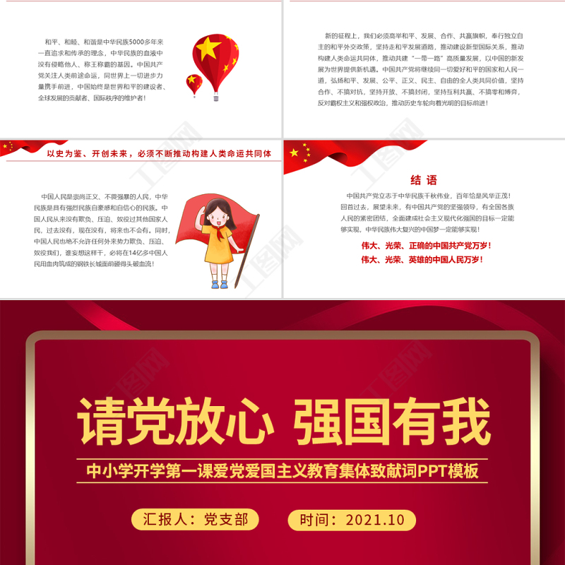 工圖網提供2021請黨放心強國有我PPT紅色莊嚴中小學少先隊開學第一課愛國主義教育集體致獻詞課件供會員免費下載。更多精彩黨課PPT素材,盡在工圖網。
