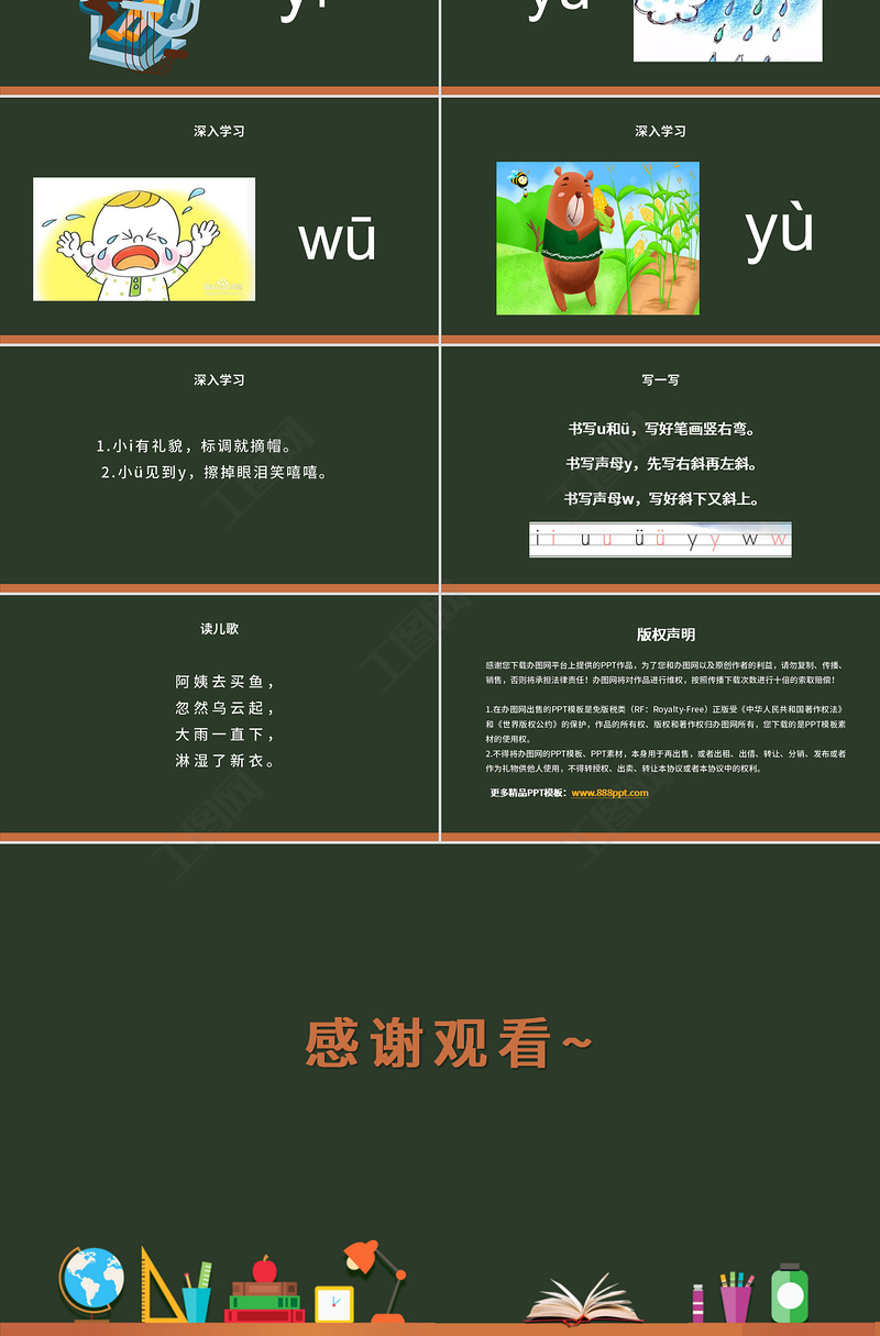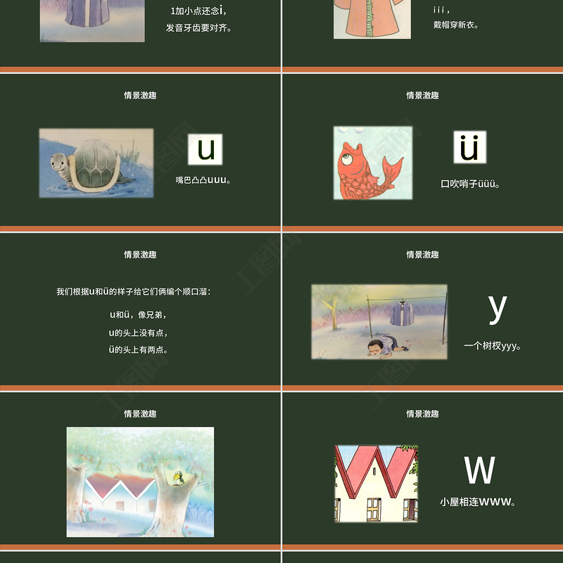 寫一寫書寫u和ü,寫好筆畫豎右彎。書寫聲母y,先寫右斜再左斜。書寫聲母w,寫好斜下又斜上。